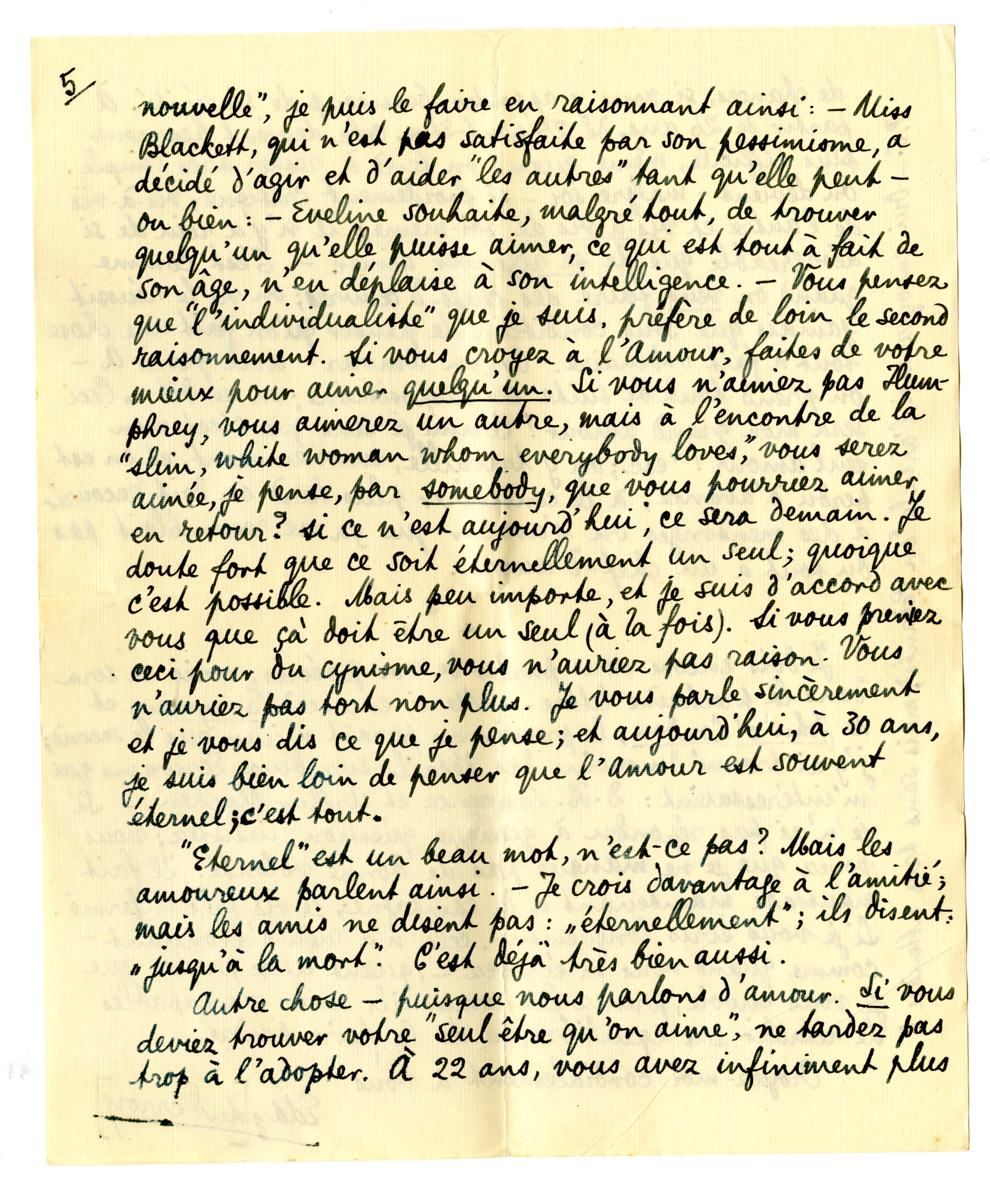 Ce que vs me dites des étudiants d'Oxford correspond assez avec l'idée que je m'étais formée d'eux. Et pourtant, il y a qq. chose dans leur ‘absence de démocratie’ qui m'est rudement sympathique. J'ai vu le peuple de très près, et je vois de très près les paysans, - à Paris j'ai mené une ‘vie de bohème’ (en 1922) qui m'a mis en contact avec pas mal de gens dans la misère: je vous assure qu'on ne perd pas beaucoup à ne pas trop les coudoyer. En '22 j'allais là en quête de ce que vous appelez ‘romance’! Ce qui en est resté est un immense dégoût de ce qui est sâle (pitoyable ou non, peu m'importe). Dans Dostojevski la misère prend un caractère de grandeur qui fait qu'on l'oublie; dans les auteurs réalistes et autres (de Zola à Ch.Louis-Philippe), elle est comme elle est: rusée et bornée à la fois, profondément antipathique et sâlissante, ne vous y trompez pas. - Vous me dites aussi: ‘It is merely natural to play the game better if you happen to have near you some one you esteem & love - or some one whom you can't esteem but whom you love all the same.’ - C'est fort bien, çà, mais ce n'est plus l'amour du prochain, c'est l'amour to court. Que cet amour, pour ne pas toujours s'occuper de soi-même, condescend à s'occuper de quelques ‘autres’, c'est encore fort normal, et c'est même sage, puisque trop s'occuper de soi épuise. - Si donc, je dois répondre par une attitude quelconque à votre ‘philosophie nouvelle’, je puis le faire en raisonnant ainsi: - Miss Blackett, qui n'est pas satisfaite par son pessimisme, a décidé d'agir et d'aider ‘les autres’ tant qu'elle peut - ou bien: - Eveline souhaite, malgré tout, de trouver quelqu'un qu'elle puisse aimer, ce qui est tout à fait de son âge, n'en déplaise à son intelligence. - Vous pensez que ‘l'individualiste’ que je suis, préfère de loin le second raisonnement. Si vous croyez à l'Amour, faites de votre mieux pour aimer quelqu'un. Si vous n'aimez pas Humphrey, vous aimerez un autre, mais à l'encontre de la ‘slim, white woman whom everybody loves’, vous serez aimée, je pense, par somebody, que vous pourriez aimer en retour? si ce n'est aujourd'hui, ce sera demain. Je doute fort que ce soit éternellement un seul; quoique c'est possible. Mais peu importe, et je suis d'accord avec vous que çà doit être un seul (à la fois). Si vous preniez ceci pour du cynisme, vous n'auriez pas raison. Vous n'auriez pas tort non plus. Je vous parle sincèrement et je vous dis ce que je pense; et aujourd'hui, à 30 ans, je suis bien loin de penser que l'Amour est souvent éternel; c'est tout.