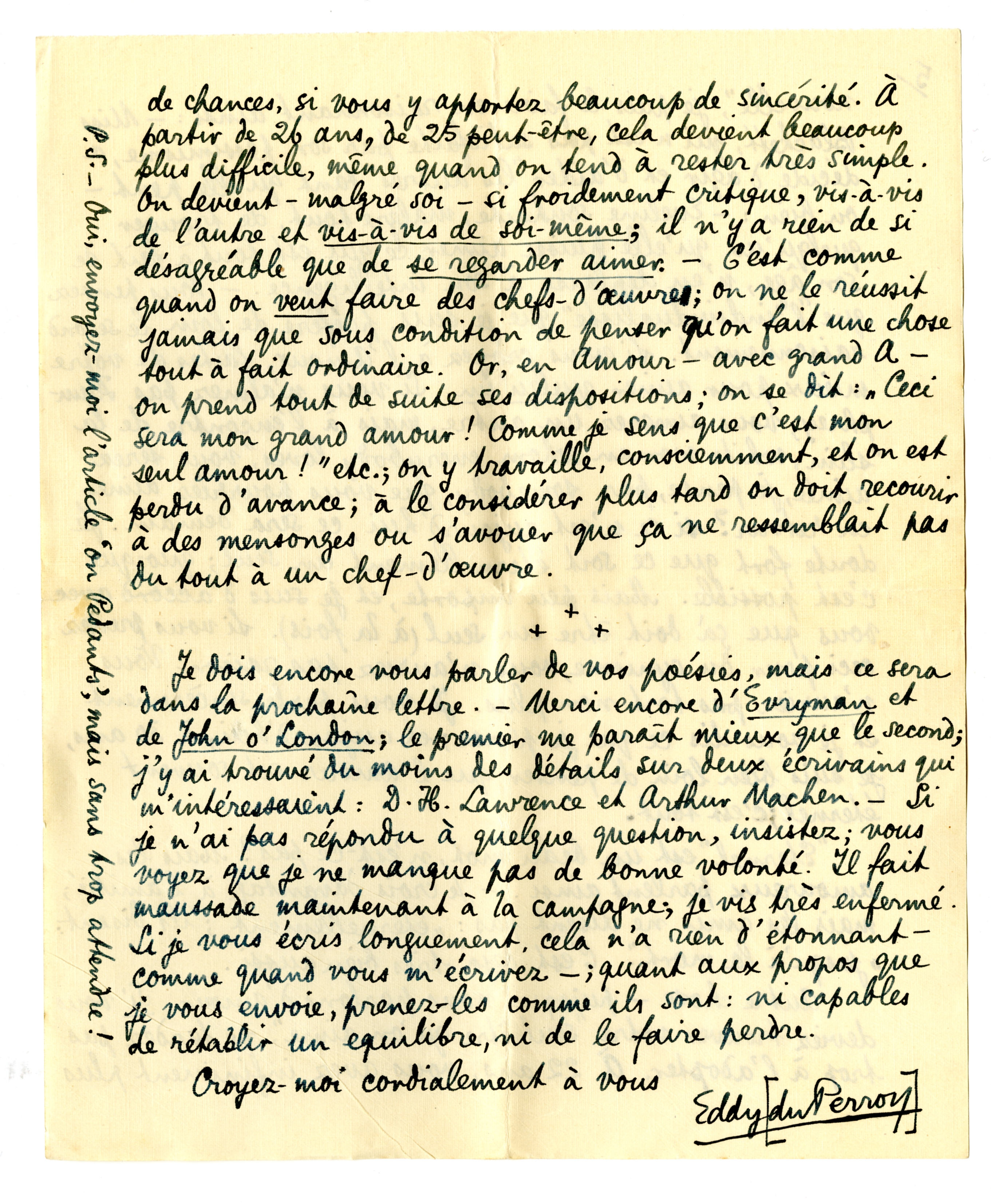 Je dois encore vous parler de vos poésies, mais ce sera dans la prochaine lettre. - Merci encore d'Everyman et de John o'London, le premier me parait mieux que le second, j'y ai trouvé au moins des détails sur deux écrivains qui m'intéressaient: D.H. Lawrence et Arthur Machen. - Si je n'ai pas répondu à quelque question, insistez; vous voyez que je ne manque pas de bonne volonté. Il fait maussade maintenant à la campagne; je vis très enfermé. Si je vous écris longuement, cela n'a rien d'étonnant - comme quand vous m'écrivez -; quant aux propos que je vous envoie, prenez-les comme ils sont: ni capables de rétablir un équilibre, ni de le faire perdre.