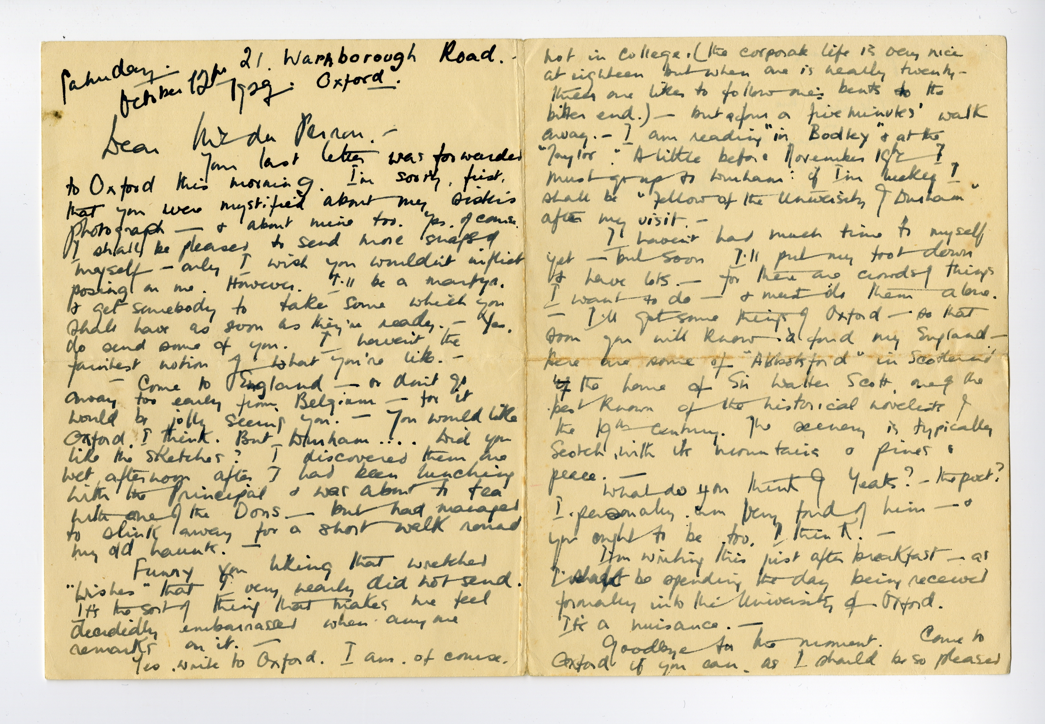 Yes, write to Oxford. I am, of course, not in College. (the corporate life is very nice at eighteen but when one is nearly twenty-three one likes to follow one's bents to the bitter end.) - but a four or five minutes' walk away. - I am reading ‘in Bodley’ & at the ‘Taylor’. A little before November 19th I must go up to Durham: if I'm lucky I shall be ‘Fellow of the University of Durham’ after my visit. -