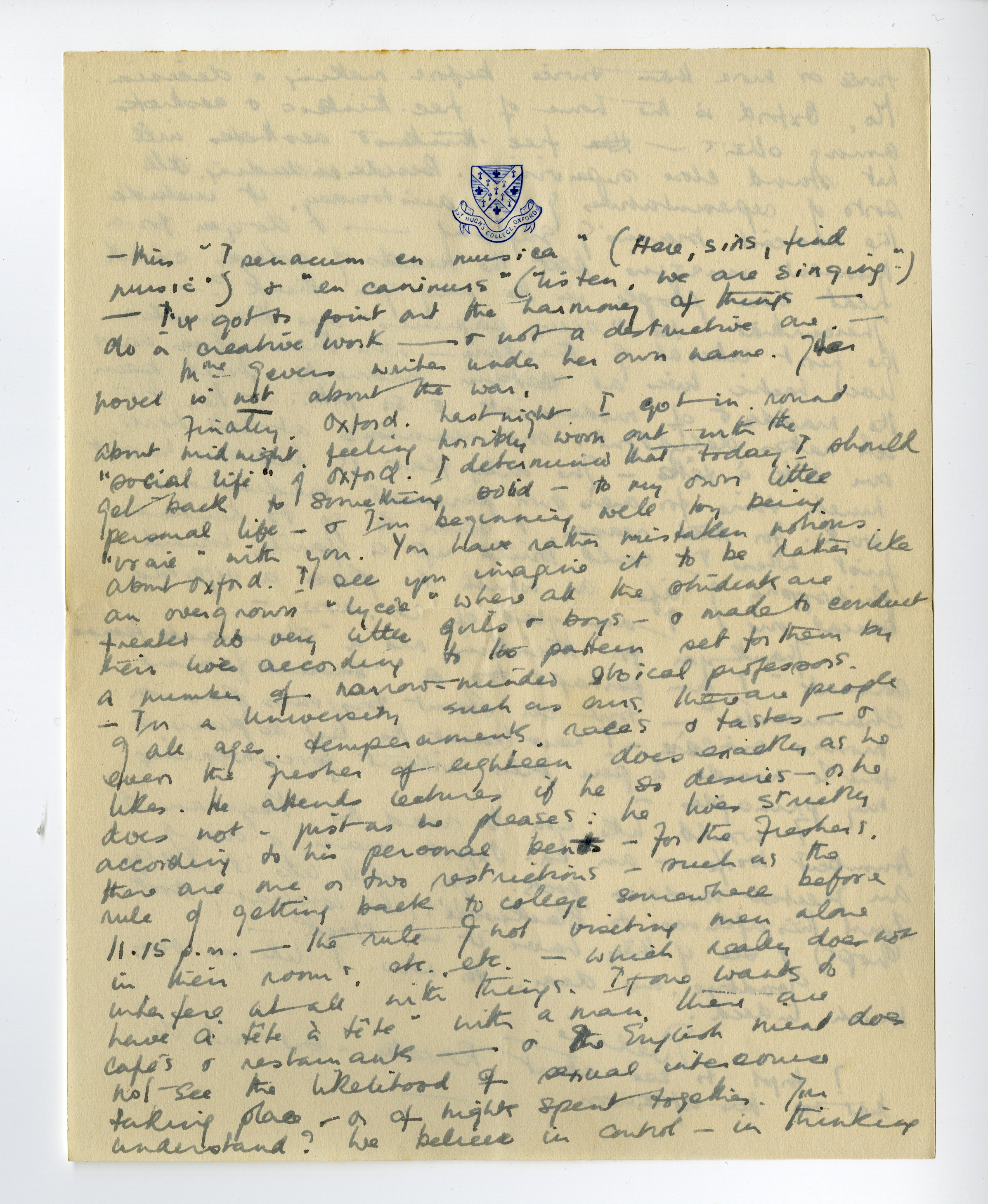 Finally, Oxford. Last night I got in round about midnight feeling horribly worn out with the ‘social life’ of Oxford. I determined that today I should get back something solid - to my own little personal life - & I'm beginning well by being ‘vraie’ with you. You have rather mistaken notions about Oxford. I see you imagine it to be rather like an overgrown ‘lycée’ where all the students are treated as very little girls & boys - & made to conduct their lives according to the pattern set for them by a number of narrow-minded stoical professors. - In a University such as ours, there are people of all ages, temperaments, races & tastes - & even the Fresher of eighteen does exactly as he likes. He attends lectures if he so desires - or he does not - just as he pleases: he lives strictly according to his personal bent - For the Freshers, there are one or two restrictions - such as the rule of getting back to college somewhere before 11.15 p.m. - the rule of not visiting men alone in their rooms, etc., etc. - which really does not interfere at all with things. If one wants to have a ‘tête à tête’ with a man, there are cafés & restaurants - & the English mind does not see the likelihood of sexual intercourse taking place - or of nights spent together. You understand? We believe in control - in thinking twice or more than twice before making a decision. No, Oxford is the home of free-thinkers & aesthetes among others - the free-thinkers & aesthetes will not stand close supervision. Besides including all sorts of representatives of our aristocracy, it includes the choicest brains of England - & do you for a moment imagine that the Heads of colleges could treat these people in the way you think? - Therewithal the ‘vieux seigneurs’ are themselves the most liberal of thinkers - who themselves have lived hectic lives at certain moments, have been the maddest of modernists & so forth. - No, it is all rather delightful: our reunions at all hours, our ‘tête à tête’. - The only flaw is that one hasn't much time for one's own personal meditation & work. For that reason, I chose to go to Durham first where I could build up a fairly sound philosophy of life on which to place a vigorous social one. I am glad of it, now. -