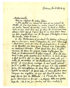 Mon cas est un peu exceptionel parce que je suis né - d'une famille beaucoup plus française que hollandaise - à Java, ce qui fait que j'ai appris le hollandais bien mieux que le français et que j'écris cette dernière langue assez correctement, peut-être, mais comme un étranger. Ceci vous explique pourquoi je suis ‘poète hollandais’. Je ferai peut-être traduire quelques-uns de mes contes en français, mais c'est un travail ingrat et désagréable et je me rends compte souvent que ma vanité, même littéraire, n'est pas très grande.