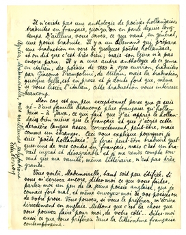 Il n'existe pas une anthologie de poésies hollandaises traduites en français, quoiqu'on en parle depuis longtemps. D'ailleurs, vous savez, ce que vaut, en général, une poésie traduite. Il y a un Allemand qui prépare une traduction en vers de quelques poètes hollandais, et on dit que c'est très bien; mais son livre n'a pas encore paru. Il y a une autre anthologie de ce genre en italien, des poésies de 1880 à 1900 environ, traduites par Giacomo Prampolini, de Milan, mais la traduction, quoique belle, est en prose et je doute fort que, même si vous lisiez l'italien, cette traduction vous intéresse beaucoup,