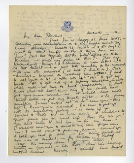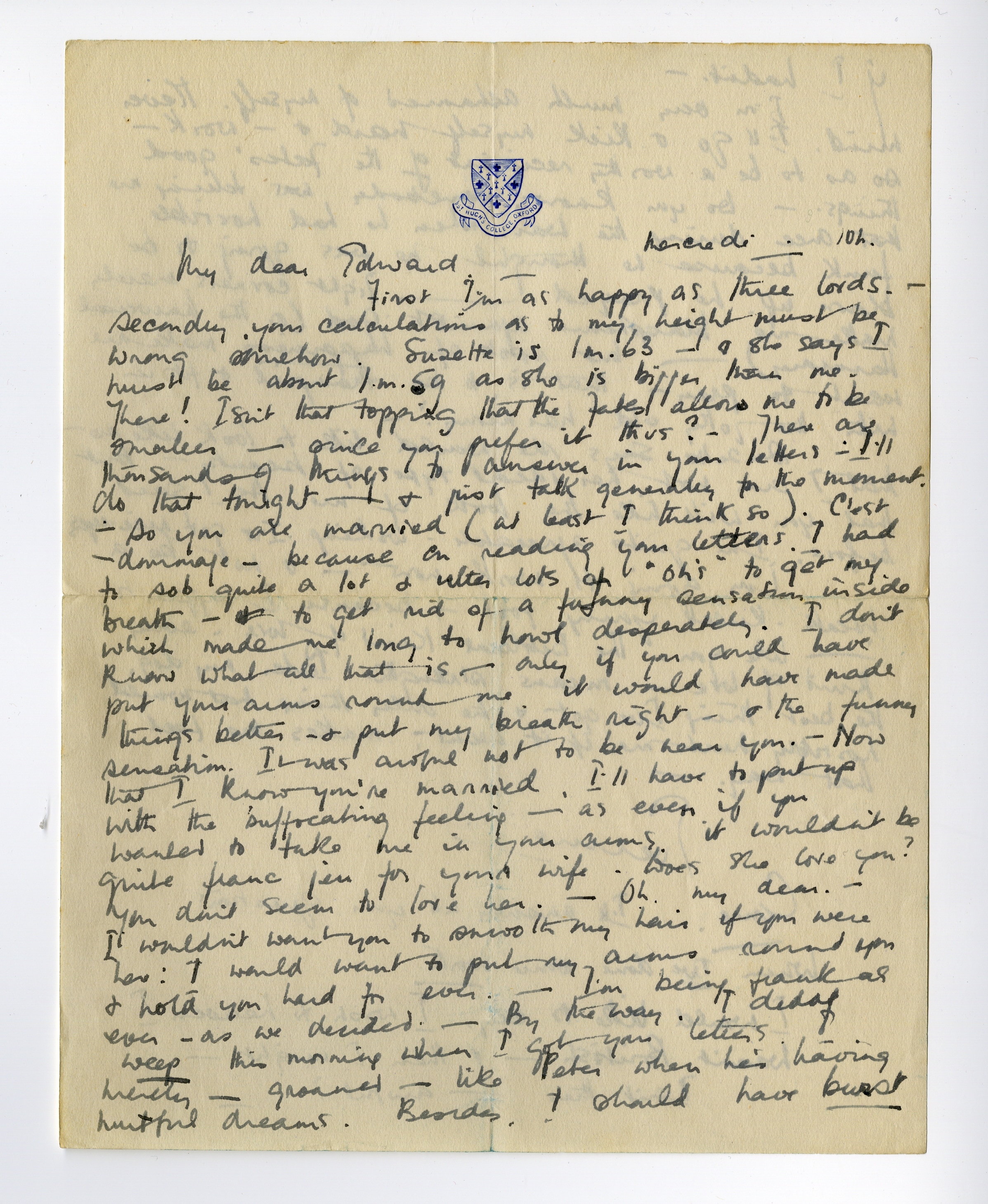 First I'm as happy as three lords. - Secondly, your calculations as to my height must be wrong somehow. Suzette is 1m.63 - & she says I must be about 1.m.59 as she is bigger than me. There! Isn't that topping that the Fates allow one to be smaller - since you prefer it thus? - There are thousands of things to answer in your letters - I'll do that tonight - & just talk generally for the moment. - So you are married (at least I think so). C'est - dommage - because on reading your letters, I had to sob quite a lot & utter lots of ‘oh's’ to get my breath - & to get rid of a funny sensation inside which made me long to howl desperately. I don't know what all that is - only if you could have put your arms round me, it would have made things better - & put my breath right - & the funny sensation. It was awful not to be near you. - Now that I know you're married, I'll have to put up with the suffocating feeling - as even if you wanted to take me in your arms, it wouldn't be quite franc jeu for your wife. Does she love you? You don't seem to love her. - Oh, my dear. - I wouldn't want you to smooth my hair if you were here: I would want to put my arms round you & hold you hard for ever. - I'm being frank as ever - as we decided. - By the way, I didn't weep this morning when I got your letters. I merely - groaned - like Peter when he's having hurtful dreams. Besides, I should have burst if I hadn't. -