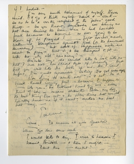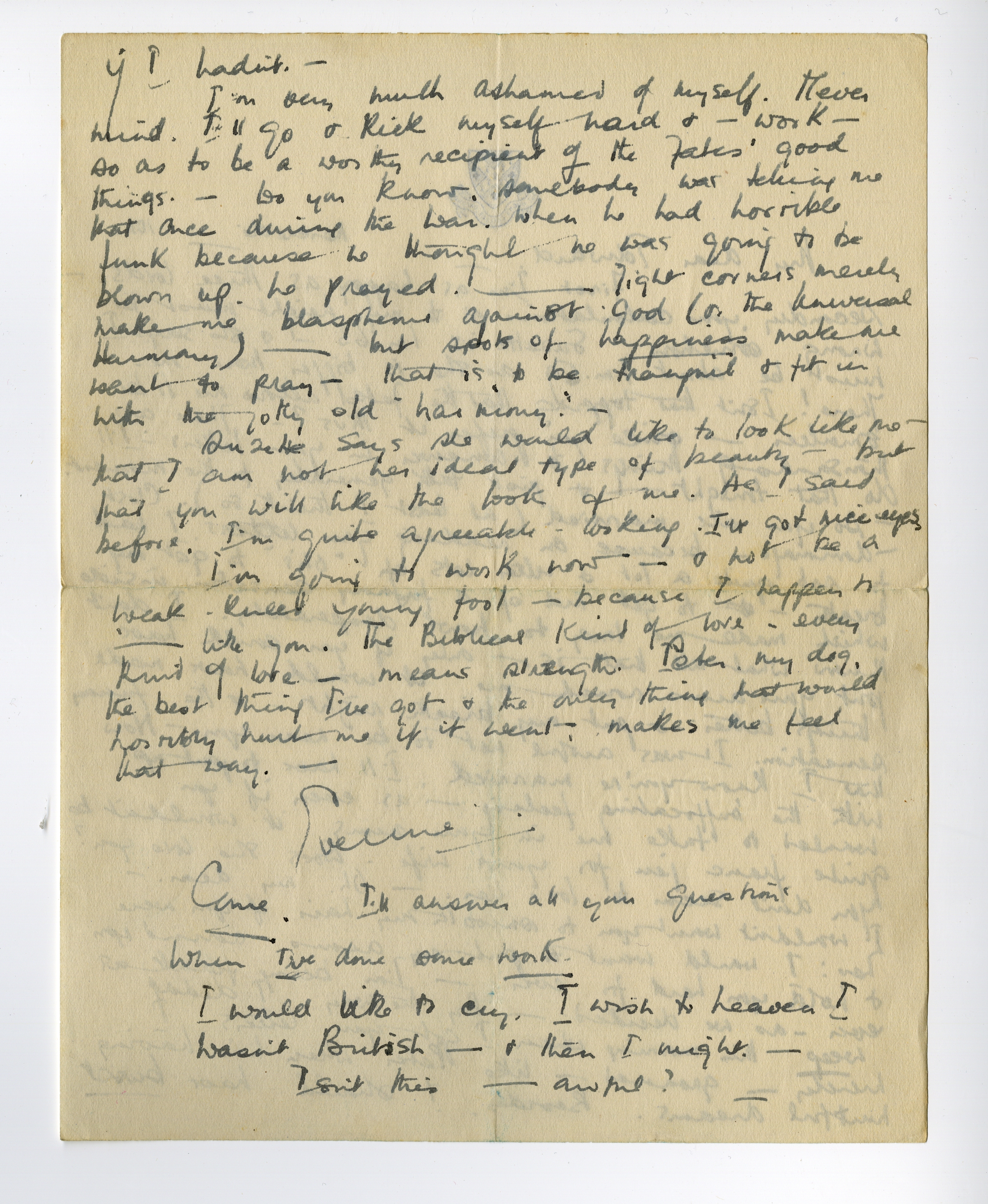 I'm very much ashamed of myself. Never mind. I'll go & kick myself hard & - work - so as to be a worthy recipient of the Fates' good things. - Do you know, somebody was telling me that once during the War, when he had horrible funk because he thought he was going to be blown up, he prayed. - Tight corners merely make me blaspheme against God (or the Universal Harmony) - but spots of happiness make me want to pray - that is, to be tranquil & to fit in with the jolly old ‘harmony.’ -