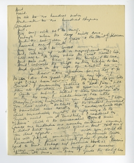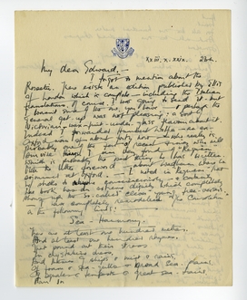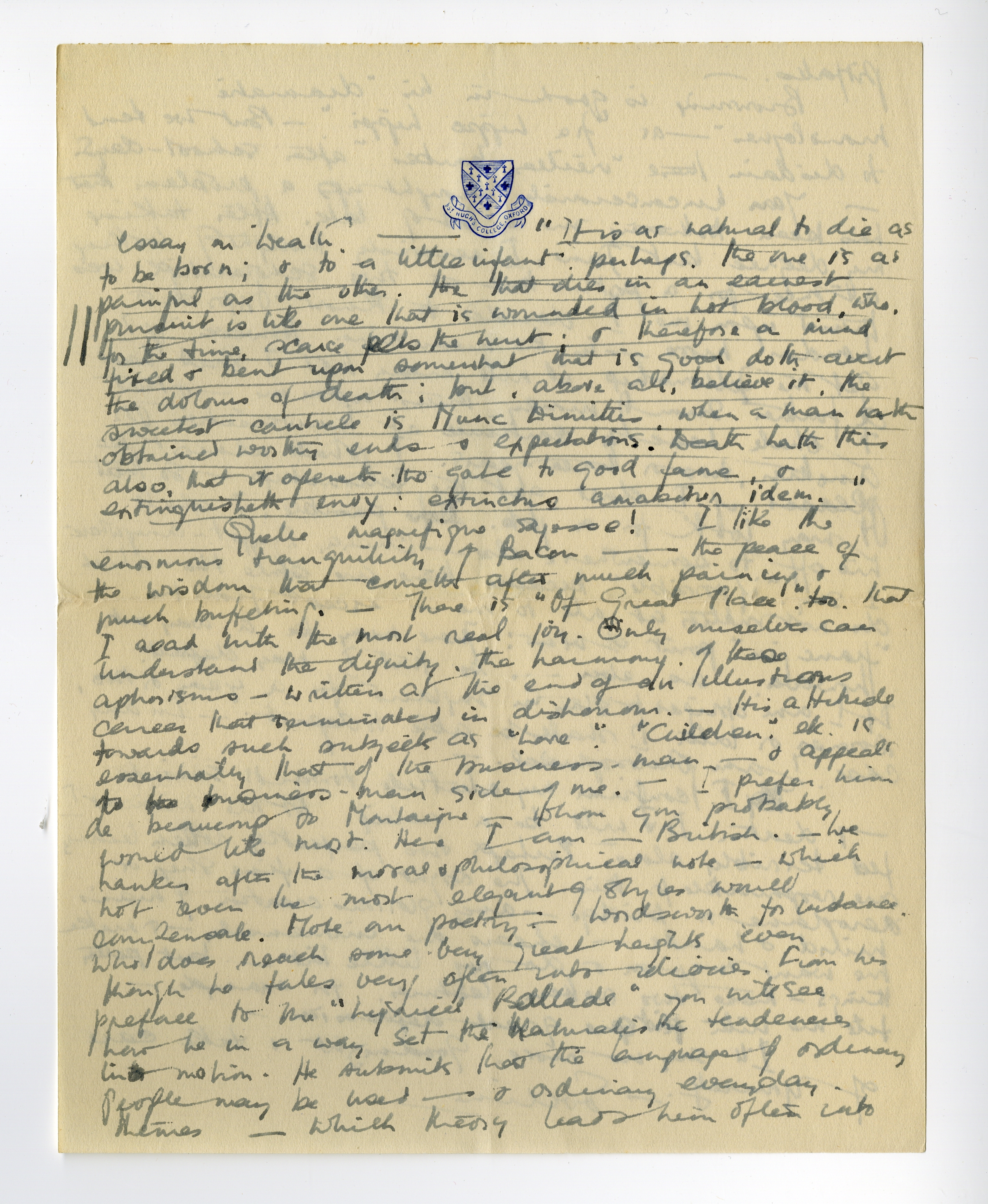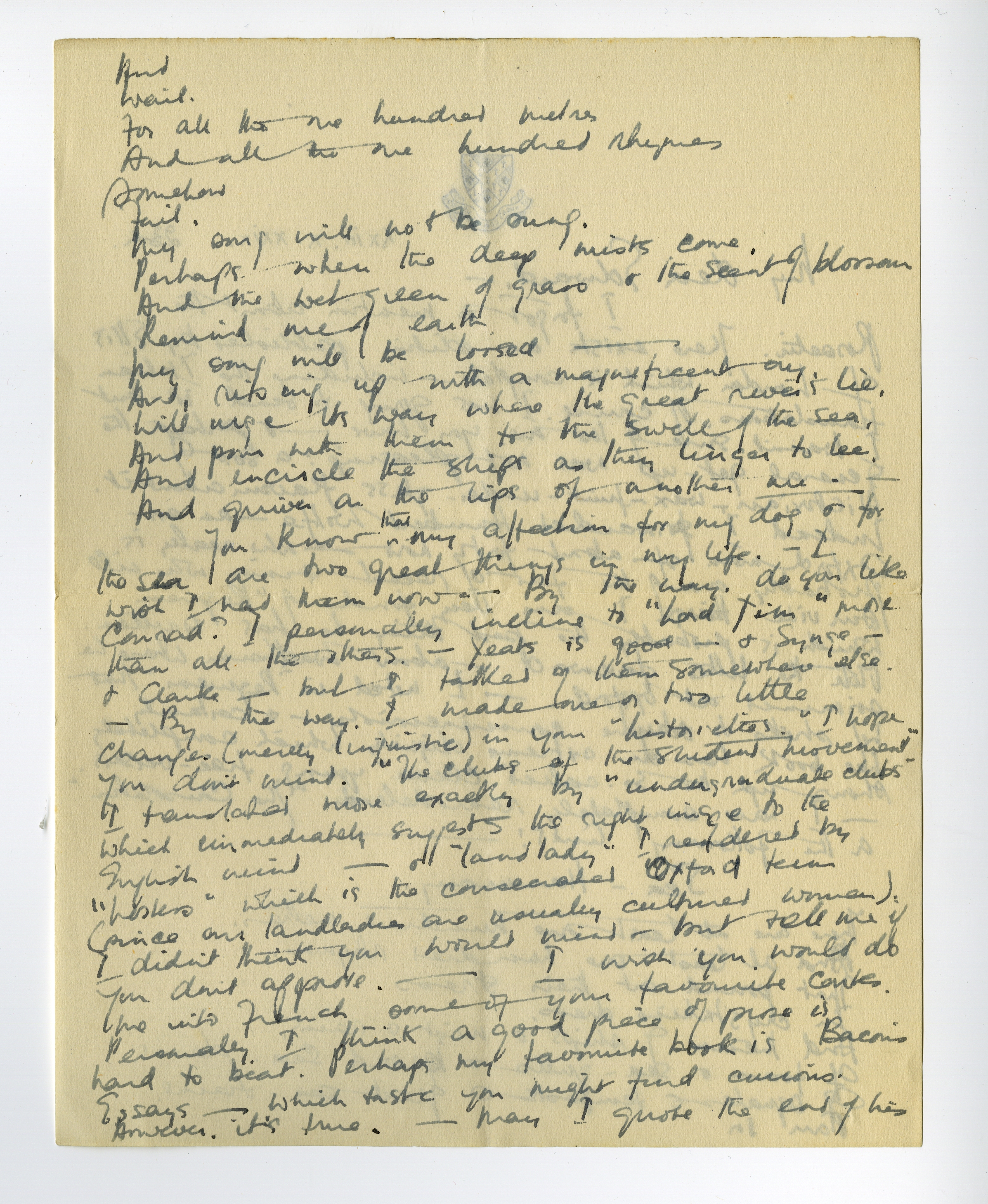 You know that my affection for my dog & for the sea are two great things in my life. - I wish I had them now - By the way, do you like Conrad? I personally incline to Lord Jim more than all the others. - Yeats is good - & Synge - & Clarke - but I talked of them somewhere else. - By the way, I made one of two little changes (merely linguistic) in your ‘historiettes’. I hope you don't mind. ‘The clubs of the student movement’ I translated more exactly by ‘undergraduate clubs’ which immediately suggests the right image to the English mind - & ‘landlady’ I rendered by ‘hostess’ which is the consecrated Oxford term (since our landladies are usually cultured women). I didn't think you would mind - but tell me if you don't approve. - I wish you would do me into French some of your favourite contes. Personally I think a good piece of prose is hard to beat. Perhaps my favourite book is Bacon's Essays - which taste you might find curious. However, it's true. - May I quote the end of his essay on Death. - ‘It is as natural to die as to be born; & to a little infant perhaps, the one is as painful as the other. He that dies in an earnest pursuit is like one that is wounded in hot blood, who, for the time, scarce feels the hurt, & therefore a mind tired & bent upon somewhat that is good doth avert the dolours of death; but, above all, believe it, the sweetest canticle is Nunc Dimittis, when a man hath obtained worthy ends & expectations. Death hath this also, that it openeth the gate to good fame, & extinguisheth envy: extinctus amabitur idem.’