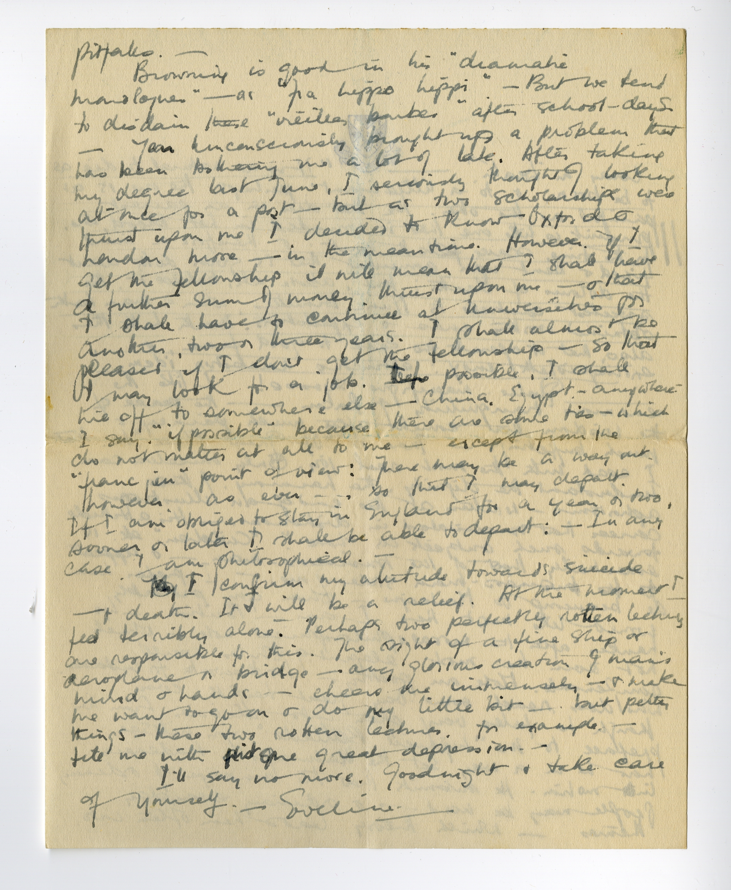 - You unconsciously brought up a problem that has been bothering me a lot of late. After taking my degree last June, I seriously thought of looking at once for a post - but as two scholarships were thrust upon me I decided to know Oxford & London more - in the meantime. However, if I get the Fellowship it will mean that I shall have a further sum of money thrust upon me - & that I shall have to continue at Universities for another two or three years. I shall almost be pleased if I don't get the Fellowship - so that I may look for a job. If possible, I shall hie off to somewhere else - China, Egypt - anywhere I say, ‘if possible’ because there are some ties - which do not matter at all to me - except from the ‘franc jeu’ point of view: There may be a way out however, as ever, - so that I may depart. If I am obliged to stay in England for a year or two, sooner or later I shall be able to depart: - In any case, I am philosophical. -