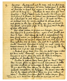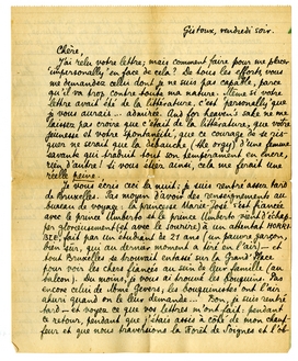 Je tâche de me corriger, mais c'est difficile. Le choix et le mouvement des personnages m'emballe toujours à un tel point que je ne trouve pas le temps de m'occuper du décor. - Voulez‘vous que nous écrivions ensemble un roman en lettres? (qui seraient Les Liaisons Dangereuses de notre siècle!) Du train où nous y allons, nous aurions bientôt un volume de 300 pages. - Et nos personnages seraient passablement modernes: le petit gros monsieur marié et la charmante jeune fille savante; et nous pourrions nous appliquer à ne pas mettre un seul baiser dans ce roman! - M. Huxley serait furieux et tourmenté, car il ne saurait plus que penser d'une vertu à ce point monstrueuse et d'une naïveté cynique à ce point (?). Nous pourrions appeler cela: Les Cerveaux Amoureux (Brains in Love); ce ne serait pas bien, dear?