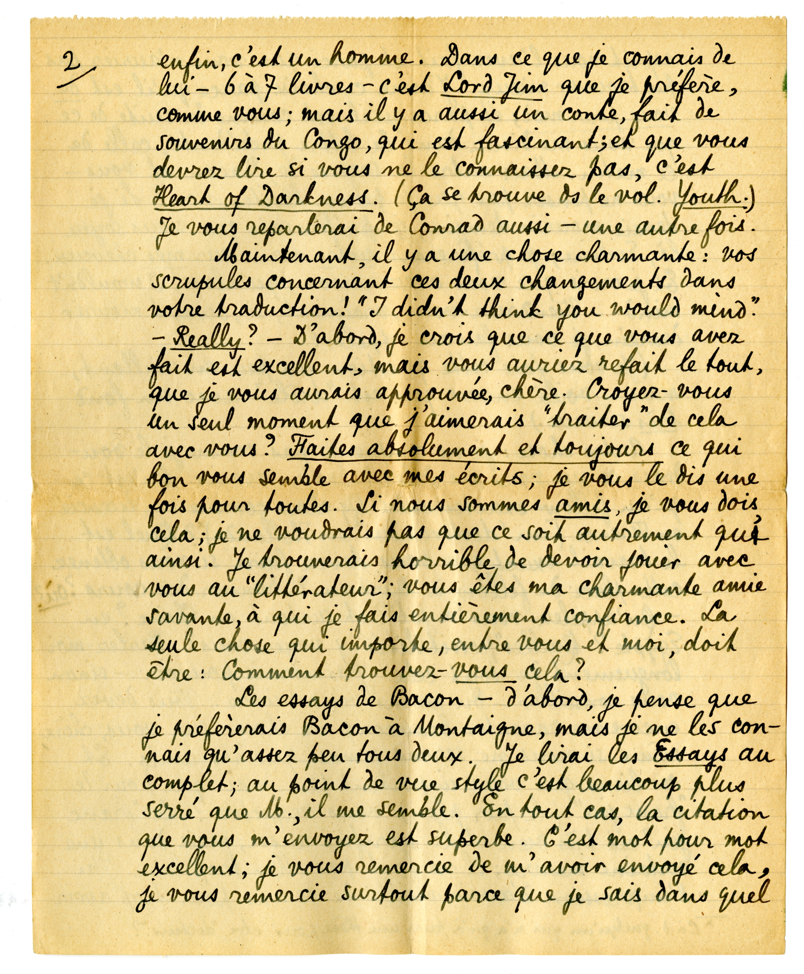 Maintenant, il y une chose charmante: vos scrupules concernant ces deux changements dans votre traduction! ‘I didn't think you would mind’. - Really? - D'abord, je crois ce que vous avez fait est excellent, mais vous auriez refait le tout, que je vous aurais approuvée, chère. Croyez-vous un seul moment que j'aimerais ‘traiter’ de cela avec vous? Faites absolument et toujours ce qui bon vous semble avec mes écrits; je vous le dis une fois pour toutes. Si nous sommes amis, je vous dois cela; je ne voudrais pas que ce soit autrement qu'ainsi. Je trouverais horrible de devoir jouer avec vous au ‘littérateur’; vous êtes ma charmante amie savante, à qui je fais entièrement confiance. La seule chose qui importe, entre vous et moi, doit être: Comment trouvez‘vous cela?