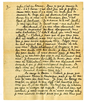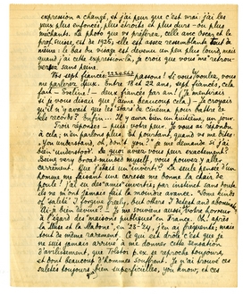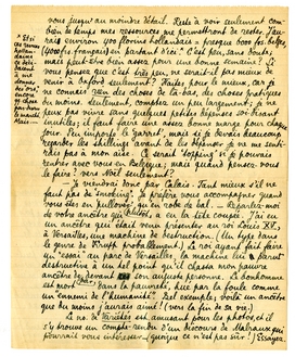 J'ai relu votre lettre; mais comment faire pour me placer ‘impersonally’ en face de cela? De tous les efforts, vous me demandez celui dont je ne suis pas capable, parce qu'il va trop contre toute ma nature. Même si votre lettre avait été de la littérature, c'est ‘personally’ que je vous aurais... admirée. And for heaven's sake ne me laissez pas croire que c'était de la littérature, que votre jeunesse et votre spontanéité, que ce courage de se risquer ne serait que la débauche (the orgy) d'une femme savante qui traduit tout son tempérament en encre, rien d'autre! Si vous étiez ainsi, cela me ferait une réelle peine