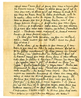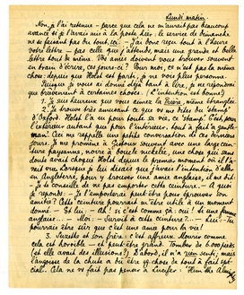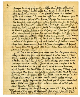 | 6. | Je ne peux pas répondre en ce moment à la partie... tout à fait charmante de votre lettre. Je me laisserai dorloter en silence. J'attends toujours une condemnation, et puis... Si vous vous trouvez heureuse ainsi, même pour très peu de temps, je veux bien être heureux COMME TROIS SEIGNEURS moi aussi. Et soyez sûre qu'en vous voyant, je ne ferai pas allusion à tout cela.