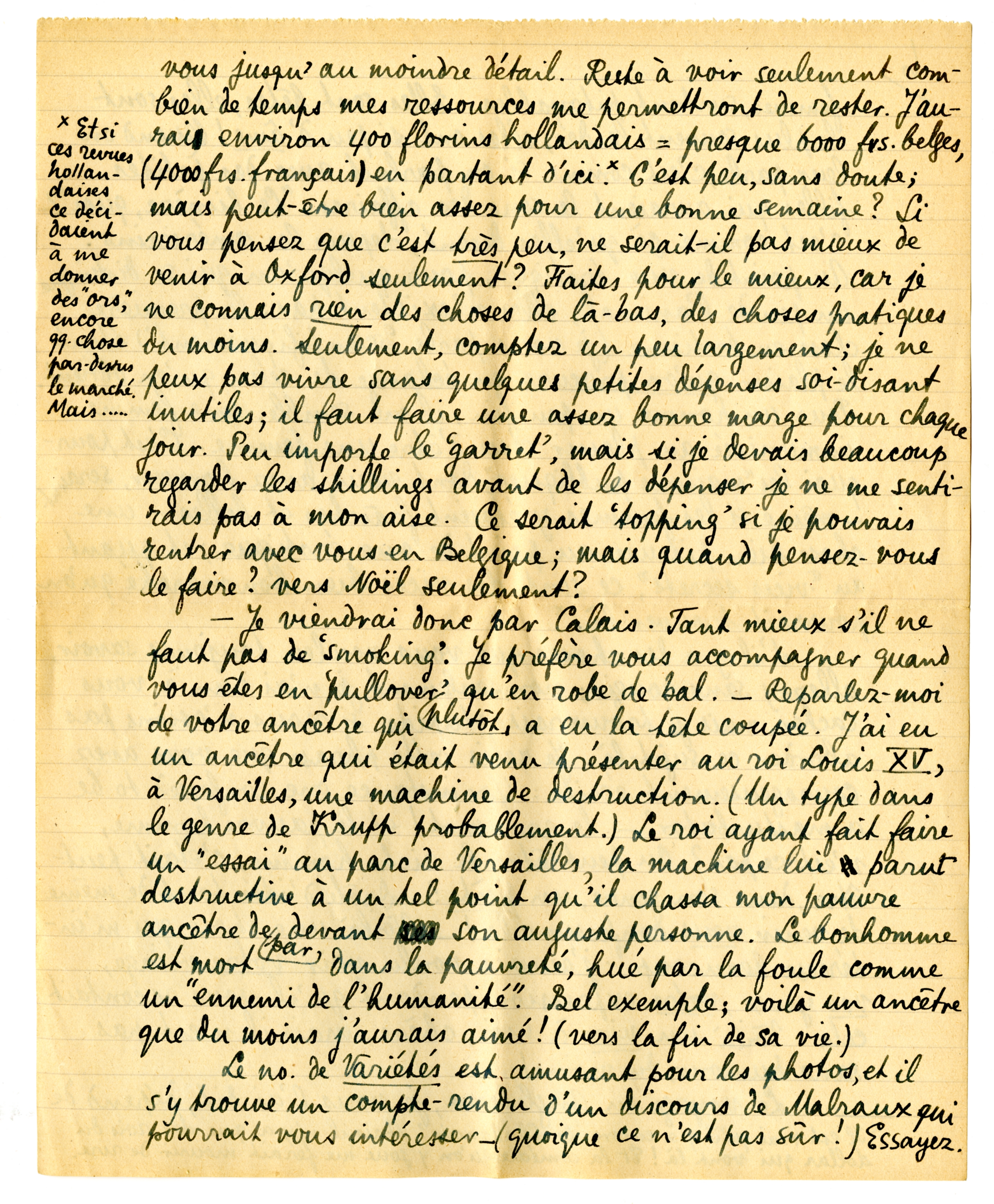 Le voyage en Angleterre, je vous l'ai dit, dépend de vous jusqu'au moindre détail. Reste à vous seulement combien de temps mes ressources me permettront de rester. J'aurais environ 400 florins hollandais = presque 6000 frs. belges, (4000 frs. français) en partant d'ici.****** C'est peu sans doute; mais peut-être bien assez pour une bonne semaine? Si vous pensez que c'est très peu, ne serait-il pas mieux de venir à Oxford seulement? Faites pour le mieux, car je ne connais rien des choses de là-bas, des choses pratiques du moins. Seulement, comptez un peu largement; je ne peux pas vivre sans quelques petites dépenses soi-disant inutiles; il faut faire une assez bonne marge pour chaque jour. Peu importe le ‘garret’, mais si je devais beaucoup regarder les shillings avant de les dépenser je ne me sentirais pas à mon aise. Ce serait ‘topping’ si je pouvais rentrer avec vous en Belgique; mais quand pensez-vous le faire? vers Noël seulement?