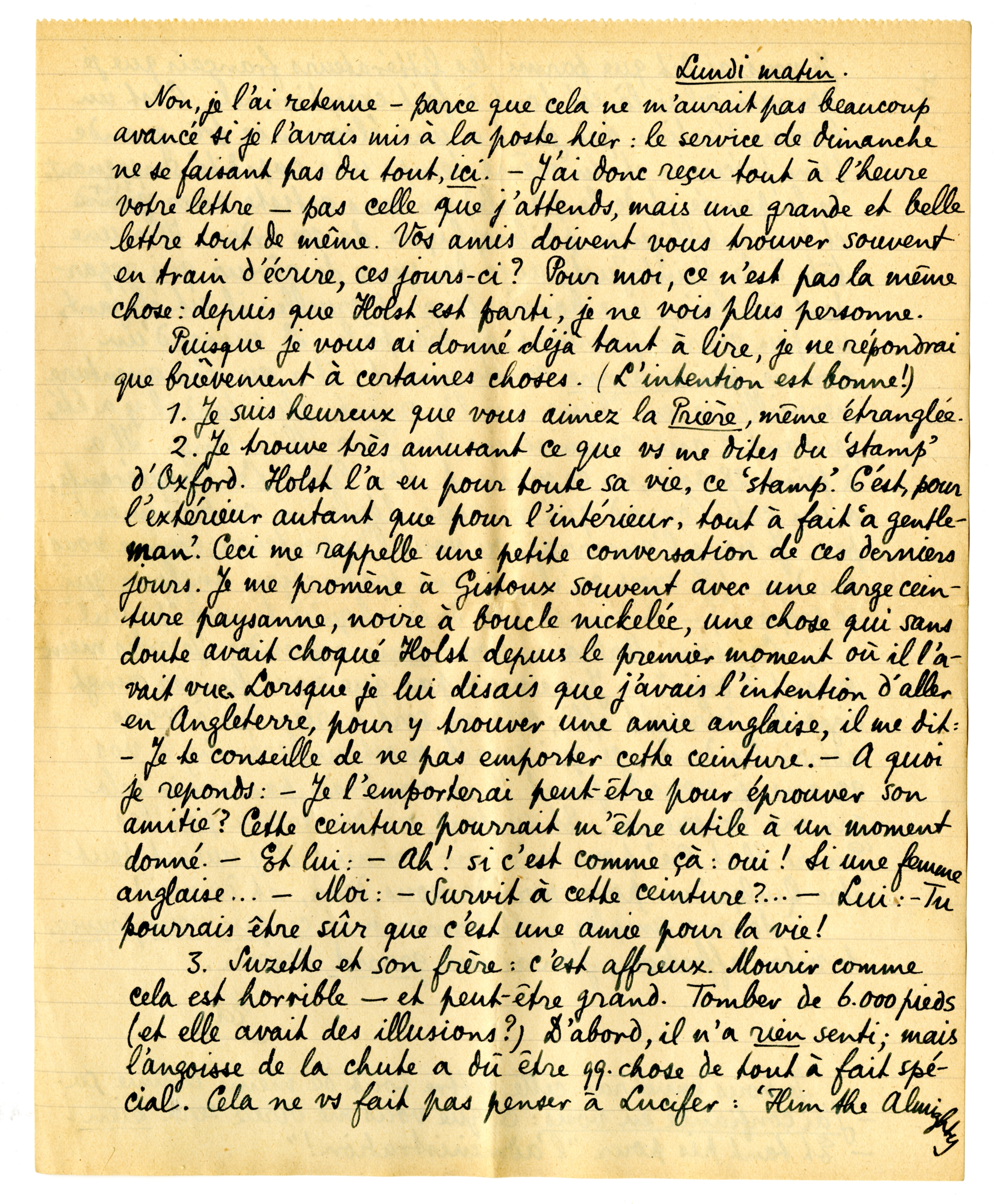 | 2. | Je trouve très amusant ce que vs me dites du ‘stamp’ d'Oxford. Holst l'a eu pour toute sa vie, ce ‘stamp’. C'est, pour l'extérieur autant que pour l'intérieur, tout à fait ‘a gent1eman’. Ceci me rappelle une petite conversation de ces derniers jours. Je me promène à Gistoux souvent avec une large ceinture paysanne, noire à boucle nickelée, une chose qui sans doute avait choqué Holst depuis le premier moment où il l'avait vue. Lorsque je lui disais que j'avais l'intention d'aller en Angleterre, pour y trouver une amie anglaise, il me dit: - Je te conseille de ne pas emporter cette ceinture. - A quoi je reponds: - Je l'emporterai peut-être pour éprouver son amitié? Cette ceinture pourrait m'être utile à un moment donné. - Et lui: - Ah! si c'est comme çà: oui! Si une femme anglaise... - Moi: - Survit à cette ceinture?... - Lui: - Tu pourrais être sûr que c'est une amie pour la vie! |