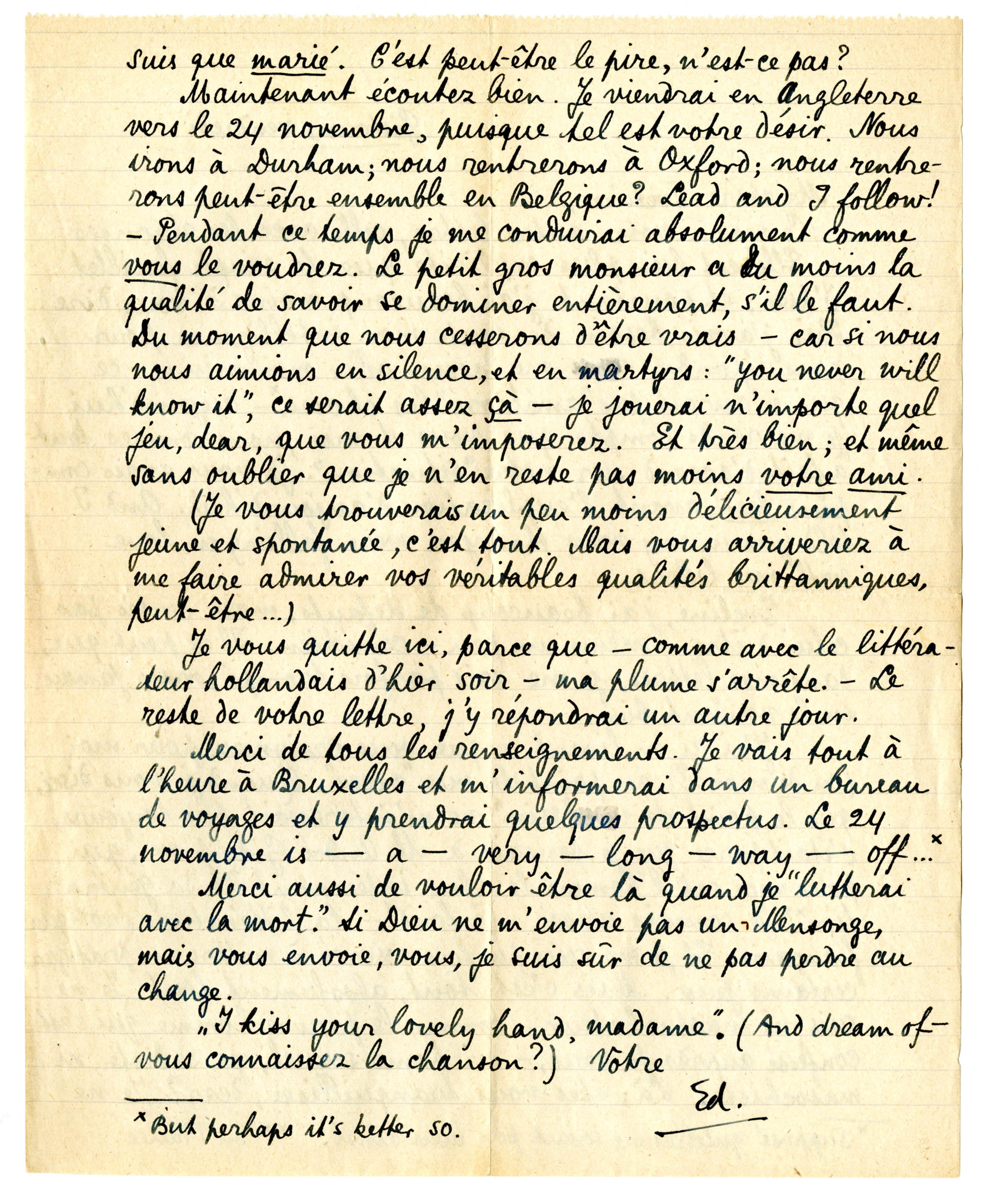 Maintenant écoutez bien. Je viendrai en Angleterre vers le 24 novembre, puisque tel est votre désir. Nous irons à Durham; nous rentrerons à Oxford; nous rentrerons peut-être ensemble en Belgique? Lead and I folow! - Pendant ce temps je me conduirai absolument comme vous le voudrez. Le petit gros monsieur a du moins la qualité de savoir se dominer entièrement, s'il le faut. Du moment que nous cesserons d'être vrais - car si nous nous aimions en silence, et en martyrs: ‘you never will know it’, ce serait assez çà - je jouerai n'importe quel jeu, dear, que vous m'imposerez. Et très bien; et même sans oublier que je n'en reste pas moins votre ami.