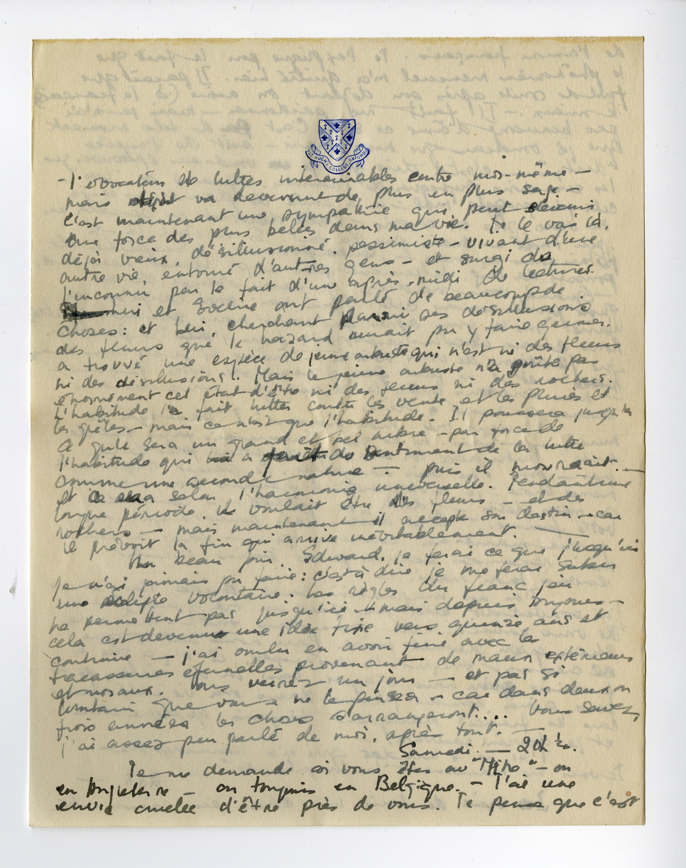 Landor est fort intéressant. Je vais le terminer maintenant - Que pensez-vous de Monsieur Teste de Valéry? Il me plaît énormément - - The ‘old Malraux’ a l'air d'être rudement intéressant, je devine, je veux dire. Il faut que je retrouve la lettre où vous m'avez parlé de lui. - Que je vais être bien avec mes chers livres! Ici dans ma chamber. Avec mes fleurs et Landor, étendue sur mon divan devant un beau feu, je constate que le bonheur est pour moi quelque chose de bien calme - et de bien égoïste. Ma propre compagnie - et peut-être des livres - ou un chien - des fleurs - un bon feu - un divan - et ça y est. J'oublie tout ce qui me tracasse dans le monde extérieur! J'oublie jusqu'à Edward - car déjà le côté poignant de mon amour pour lui s'est adouci - et je suis calme. Edward fait partie de l'harmonie universelle: il a été d'abord quelque chose qui m'a fait souffrir - l'évocation de luttes interminables entre moi-même - mais l'esprit va devenir de plus en plus sage - c'est maintenant une sympathie qui peut devenir une à forces des plus belles dans ma vie. Je te vois là, déjà vieux, désillusionné, pessimiste - vivant d'une autre vie, entouré d'autres gens - et surgi de l'inconnu par le fait d'un après-midi de lectures. Lui et Eveline ont parlé de beaucoup de choses: et lui, cherchant parmi ses désillusions des fleurs que le hasard aurait pu y faire germes, a trouvé une espèce de jeune artiste qui n'est ni des fleurs ni des désillusions. Mais le jeune artiste ne goûte pas énormément cet état d'être ni des fleurs ni des rochers. L'habitude l'a fait lutter contre les vents et les pluies et les grêles - mais ce n'est que l'habitude. Il poussera jusqu'à ce qu'il sera un grand et bel arbre - par force de l'habitude qui a fait des sentiments de la lutte comme une seconde nature - puis il mourrait - et ce sera selon l'harmonie universelle. Pendant une longue période, il voulait l'être* des fleurs - et des rochers - mais maintenant il accepte son destin - car il prévoit la fin qui arrive inévitablement. -