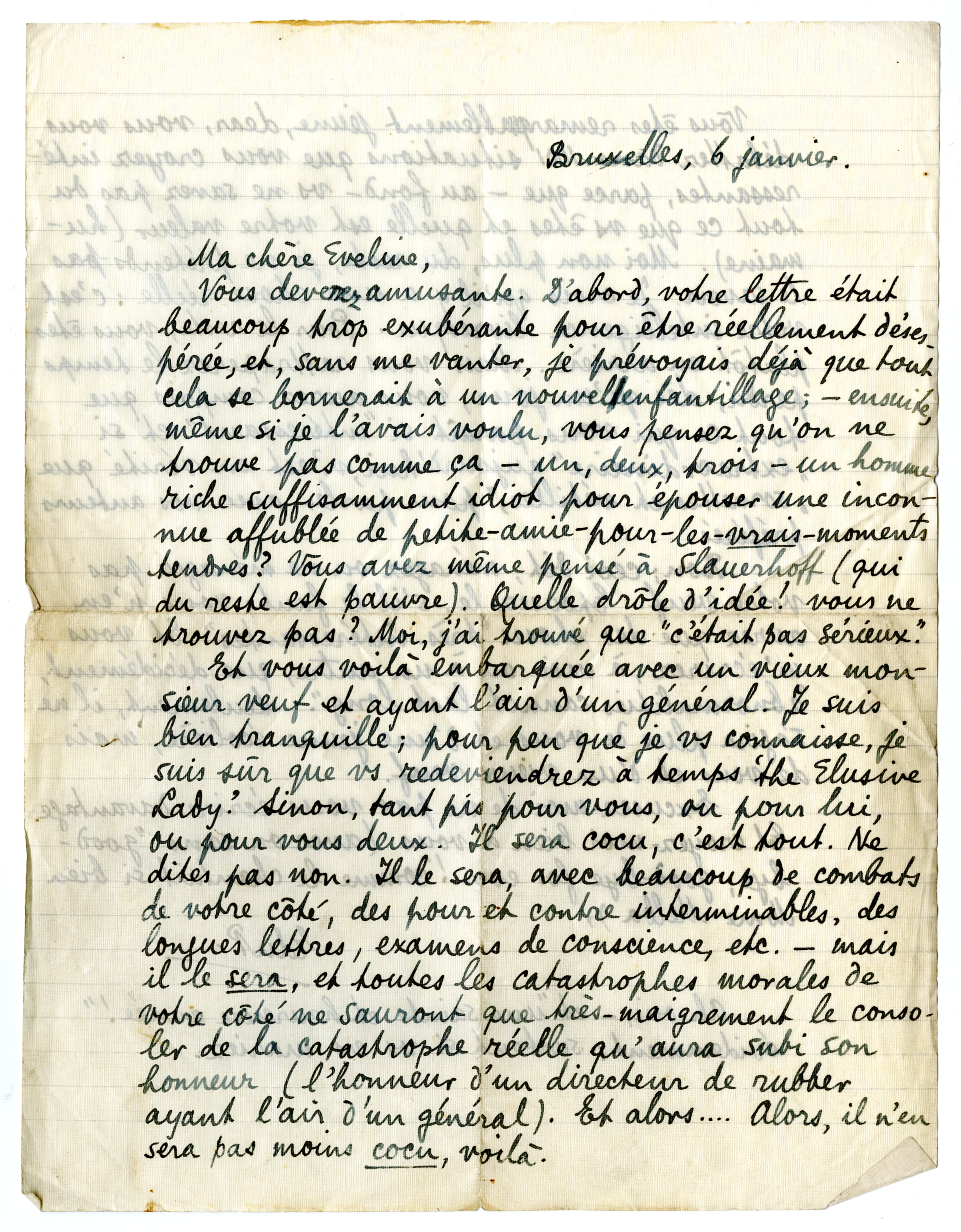 Vous devenez amusante. D'abord, votre lettre était beaucoup trop exubérante pour être réellement désespérée, et, sans me vanter, je prévoyais déjà que tout cela se bornerait à un nouvel enfantillage; - ensuite, même si je l'avais voulu, vous pensez qu'on ne trouve pas comme ça - un, deux, trois - un homme riche suffisamment idiot pour épouser une inconnue affublée de petite-amie-pour-les-vrais-moments tendres? Vous avez même pensé à Slauerhoff (qui du reste est pauvre). Quelle drôle d'idée! vous ne trouvez pas? Moi, j'ai trouvé que ‘c'était pas sérieux'.