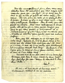 Bon; ceci dit, ménagez ou ne ménagez pas votre veuf. Epousez-le, s'il le faut; vous n'en aurez que des choses ‘très-intéressantes’. Et vous m'écrirez, à moi ou à un autre, que décidément, ‘abnormalities cannot last long’. Seulement, il ne s'agira plus de vous et d'une jeune écolière, mais de vous et d'un vieux veuf.