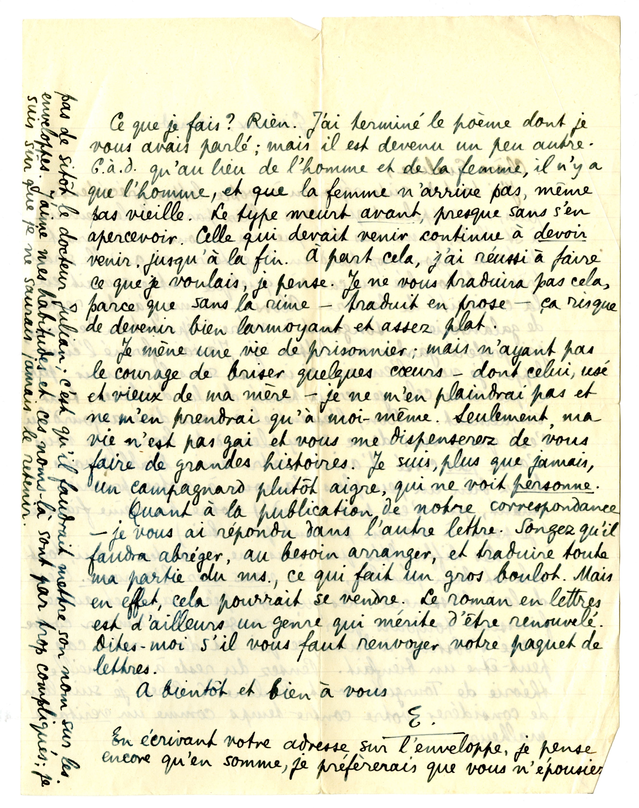 Quant à la publication de notre correspondance - je vous ai répondu dans l'autre lettre. Songez qu'il faudra abréger, au besoin arranger, et traduire toute ma partie du ms., ce qui fait un gros boulot. Mais en effet, cela pourrait se vendre. Le roman en lettres est d'ailleurs un genre qui mérite d'être renouvelé. Dites-moi s'il vous faut renvoyer votre paquet de lettres.
