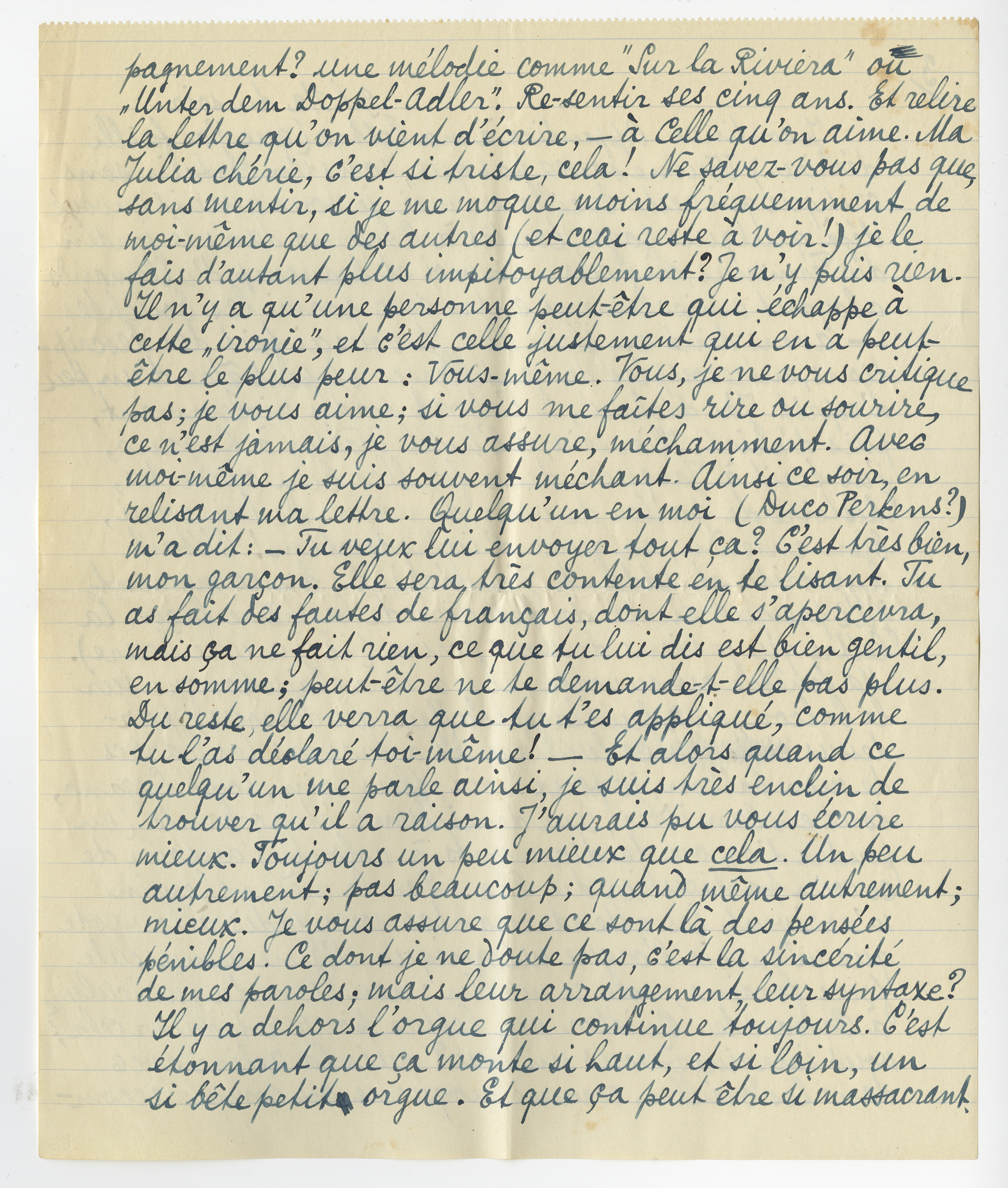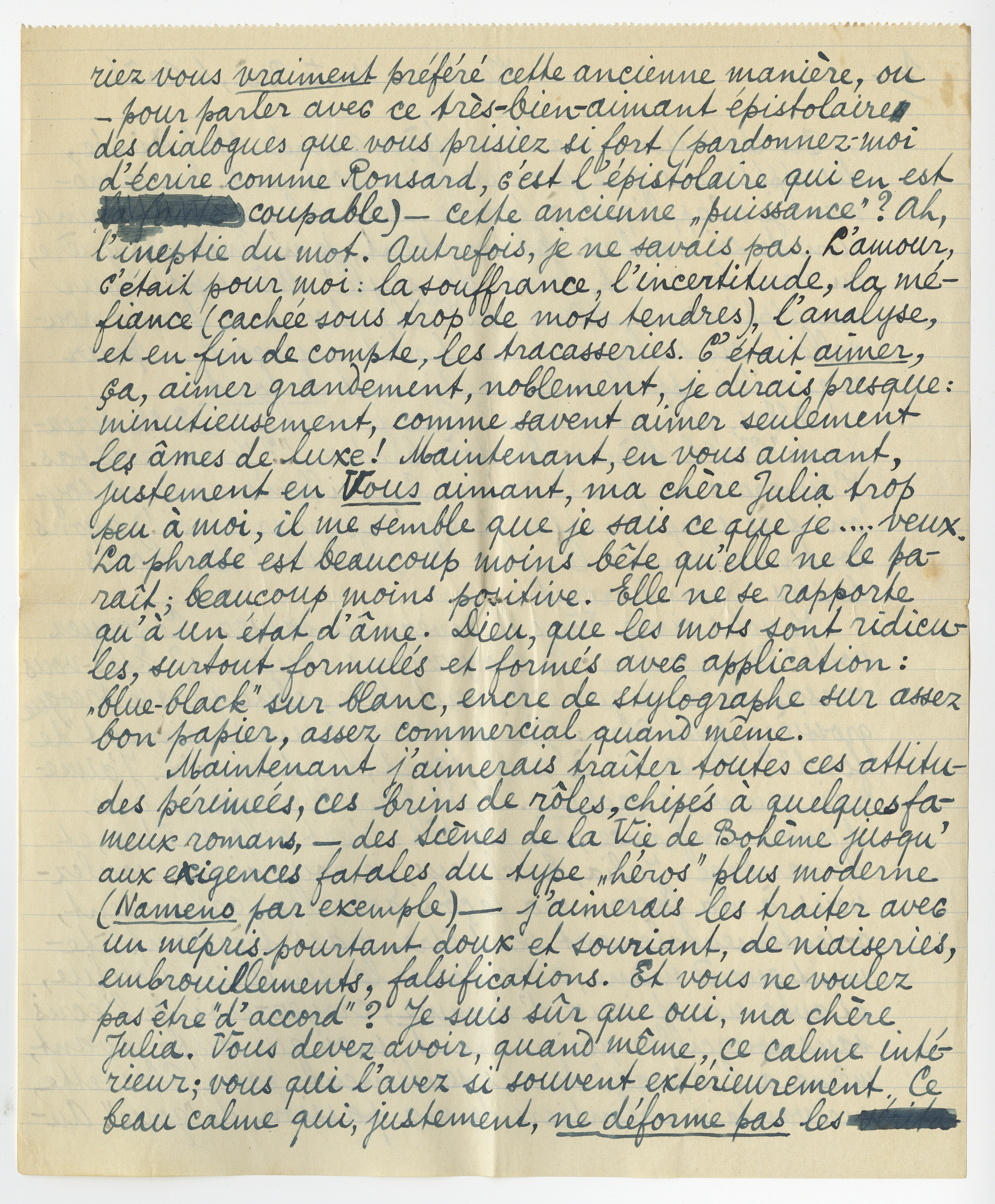 Maintenant j'aimerais traîter toutes ces attitudes périmées, ces brins de rôles, chipés à quelques fameux romans, - des Scènes de la Vie de Bohème jusqu'aux exigences fatales du type ‘héros’ plus moderne (Nameno par exemple) - j'aimerais les traiter avec un mépris pourtant doux et souriant, de niaiseries, embrouillements, falsifications. Et vous ne voulez pas être ‘d'accord’? Je suis sûr que oui, ma chère Julia. Vous devez avoir, quand même, ce calme intérieur; vous qui l'avez si souvent extérieurement. Ce beau calme qui, justement, ne déforme pas les sentiments.