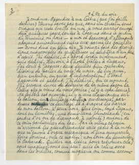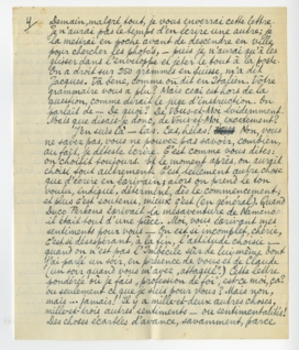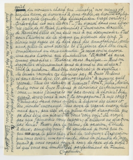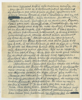 Je continue toujours. Vous allez rire à votre tour, isn't it? vous et l'épistolaire, s'il se trouve toujours là, de tout ce papier qui vous arrive - à travers les ‘reths’ (!) de mes ‘principes’. Mais c'est que, une fois commencée, j'aimerais que cette lettre soit terminée. Ou plus ou moins! Et pourtant je sais d'avance qu'elle ne le sera jamais; puisqu'elle est commencée ‘en longueur’. Le style ample, etc. - contraire du style direct. Le style épistolaire, dégagé! Vous voyez combien les modernes ont raison, en recherchant la synthése. Seulement, une lettre synthétique, c'est à peine une lettre. Que diriez-vous si je ne vous écrivais que cette seule phrase, sur beaucoup de blanc: