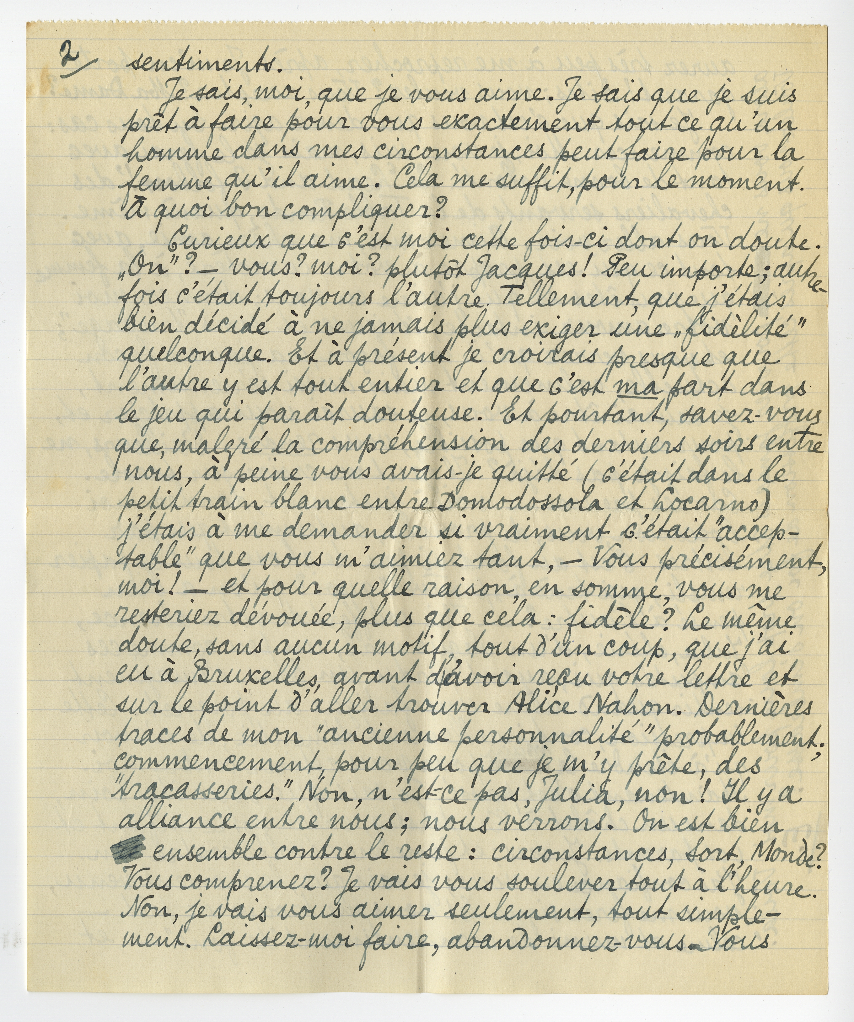 Curieux que c'est moi cette fois-ci dont on doute. ‘On’? - vous? moi? plutôt Jacques! Peu importe; autrefois c'était toujours l'autre. Tellement, que j'étais bien décidé à ne jamais plus exiger une ‘fidèlité’ quelconque. Et à présent je croirais presque que l'autre y est tout entier et que c'est ma part dans le jeu qui paraît douteuse. Et pourtant, savez-vous que, malgré la compréhension des derniers soirs entre nous, à peine vous avais-je quitté (c'était dans le petit train blanc entre Domodossola et Locarno) j'étais à me demander si vraiment c'était ‘acceptable’ que vous m'aimiez tant, - Vous précisément moi! - et pour quelle raison, en somme, vous me resteriez dévouée, plus que cela: fidèle? Le même doute, sans aucun motif, tout d'un coup, que j'ai eu à Bruxelles, avant d'avoir reçu votre lettre et sur le point d'aller trouver Alice Nahon. Dernières traces de mon ‘ancienne personnalité’ probablement; commencement, pour peu que je m'y prête, des ‘tracasseries.’ Non, n'est-ce pas, Julia, non! Il y a alliance entre nous; nous verrons. On est bien ensemble contre le reste: circonstances, Sort, Monde? Vous comprenez? Je vais vous soulever tout à l'heure. Non, je vais vous aimer seulement, tout simplement. Laissez-moi faire, abandonnez-vous. Vous aurez très peu à me reprocher, après. Je m'en porte garant! Dites; vous voulez? Vous acceptez? Ma Dame?
