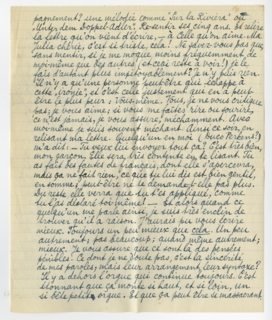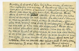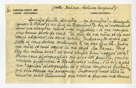 Dernière feuille, dernière - ou première? - demande (pensez à Athos et au Duc de Beaufort!): En m'installant dans ma chambre relevé une injustice: il me manque une bonne photo de vous. J'ai celle de ma mêre et de mes ‘soeurs adoptées’, les deux petites Jordaan; ce serait injuste si vous deviez continuer à ne pas être là. Entre ma mère et mes soeurs il me faut Ma Dame. Vous êtes du même avis? et vous voulez bien ‘risquer’ cela? Faites-vous photographier au plus tôt possible, voulez-vous; de préférence à Kandersteg même, s'il n'y a pas un ‘regular’ photographe, il y aura toujours quelqu'un qui s'en occupe en amateur. Informez-vous chez le sinistre petit Allemand qui vous a fourni ma canne.