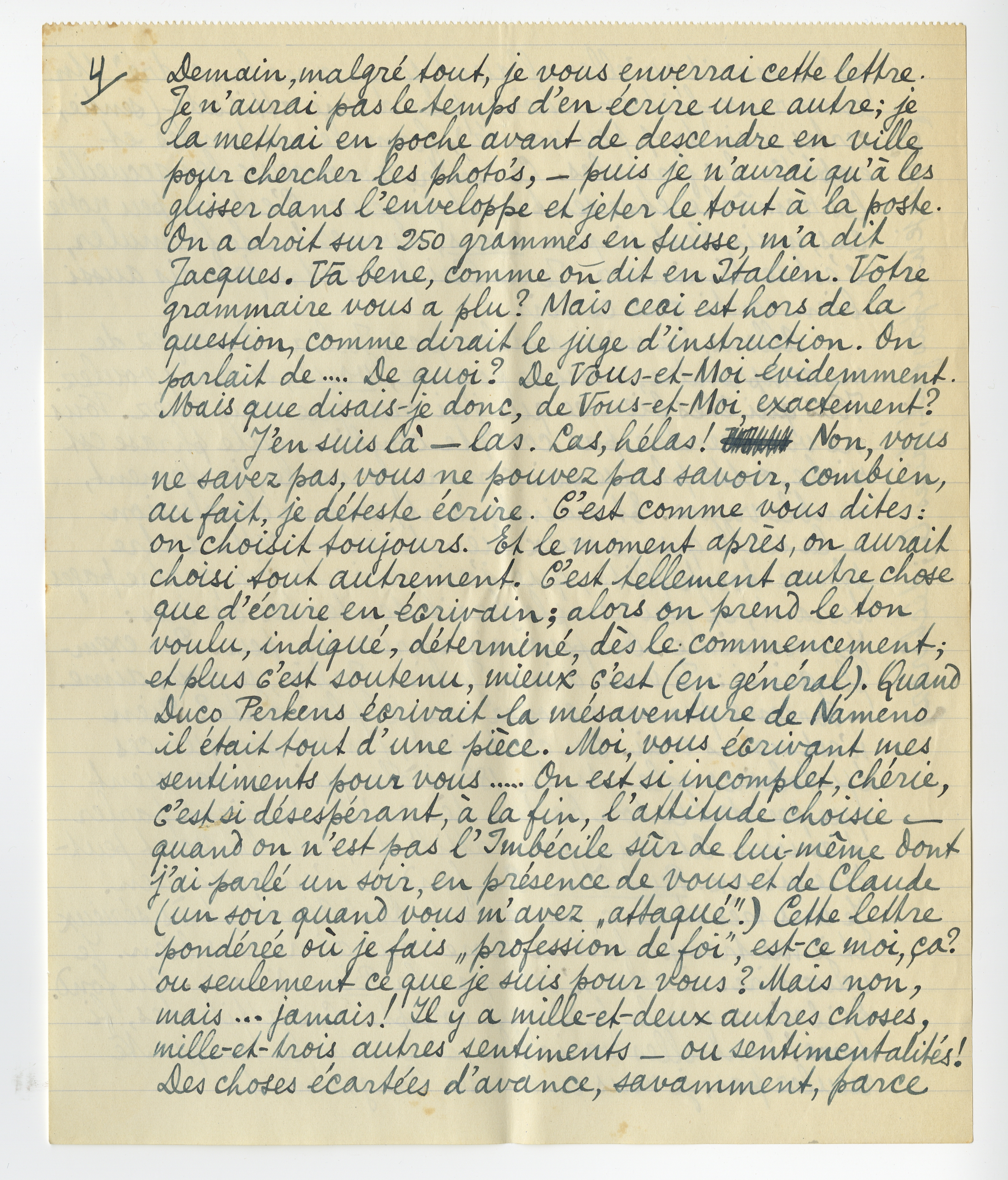 Je sais que c'est vous qui devez agir. En tous cas: commencer. Moi, je vous suis, mais je le ferai avec tant de bonne volonté. Le ‘Lead and I follow!’ des chevaliers servants de la Table Ronde, quand même. Vous allez voir. Aimez-moi, ma chère amie, avec tout ce qui est propre à votre caractère, à la femme que vous êtes et que j'aime en vous; donnez-moi votre amour intacte, sérieuse et sans ‘trucage’; et vous verrez qu'à ma façon, ma pauvre façon actuelle, calmement mais aussi sérieusement, je saurai être à vous, je saurai vous apprécier et, pour autant que possible, vous rendre. D'ailleurs, ne le fais-je pas déjà? Il faut me croire sur parole. Car les preuves - voilà justement, donnez-moi l'occasion, vous, de prouver, autrement que par lettres. C'est au fond si peu de chose tout ce papier rempli, qui tend à ‘prouver’ quoi? qu'on a bien pensé à l'autre? - J'ai souffert de votre absence, Julia, chérie, d'un vague mal, un peu comme ces amputés qui, ayant perdu un bras, s'imaginent sentir quand même une fatigue au poignet. Cette impression, continuellement démentie, de n'avoir qu'à étendre la main pour vous attirer contre moi. Maintenant c'est passé. Je sais que vous êtes loin, dans un châlet à Kandersteg, entre votre enfant et vos parents. Je sais; et je ne me révolte contre rien. J'ai confiance en vous; je sais que, le moment venu, vous me ferez signe. Et vous me trouverez prêt - calme et muni de mon sentiment ‘de fond’ - et alors, vous ne pourriez jamais être trop loin pour moi. Voilà. Voulez-vous qu'après cette profession de foi on s'embrasse?