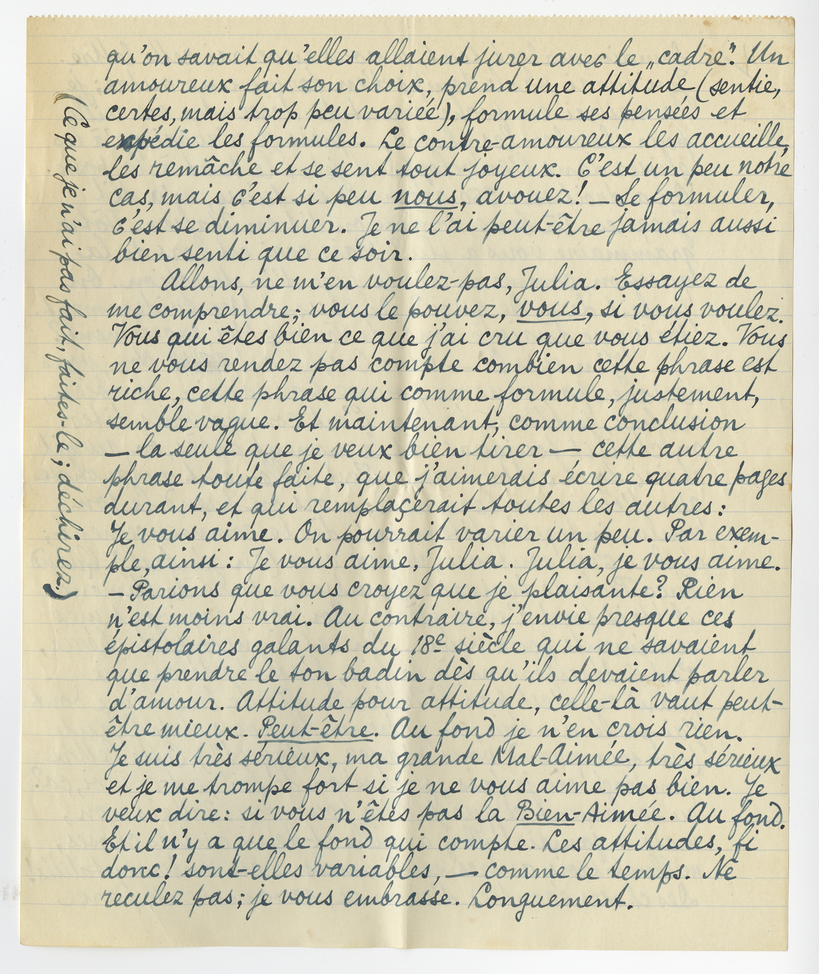 Allons, ne m'en voulez-pas, Julia. Essayez de me comprendre; vous le pouvez, vous, si vous voulez. Vous qui êtes bien ce que j'ai cru que vous étiez. Vous ne vous rendez pas compte combien cette phrase est riche, cette phrase qui comme formule, justement, semble vague. Et maintenant, comme conclusion - la seule que je veux bien tirer - cette autre phrase toute faite, que j'aimerais écrire quatre pages, durant, et qui remplaçerait toutes les autres: Je vous aime. On pourrait varier un peu. Par exemple, ainsi: Je vous aime, Julia. Julia, je vous aime. - Parions que vous croyez que je plaisante? Rien n'est moins vrai. Au contraire, j'envie presque ces épistolaires galants du 18e siècle qui ne savaient que prendre le ton badin dès qu'ils devaient parler d'amour. Attitude pour attitude, celle-là vaut peut-être mieux. Peut-être. Au fond je n'en crois rien. Je suis très sérieux, ma grande Mal-Aimée, très sérieux et je me trompe fort si je ne vous aime pas bien. Je veux dire: si vous n'êtes pas la Bien-Aimée. Au fond. Et il n'y a que le fond qui compte. Les attitudes, fi donc! sont-elles variables, - comme le temps. Ne reculez pas; je vous embrasse. Longuement.