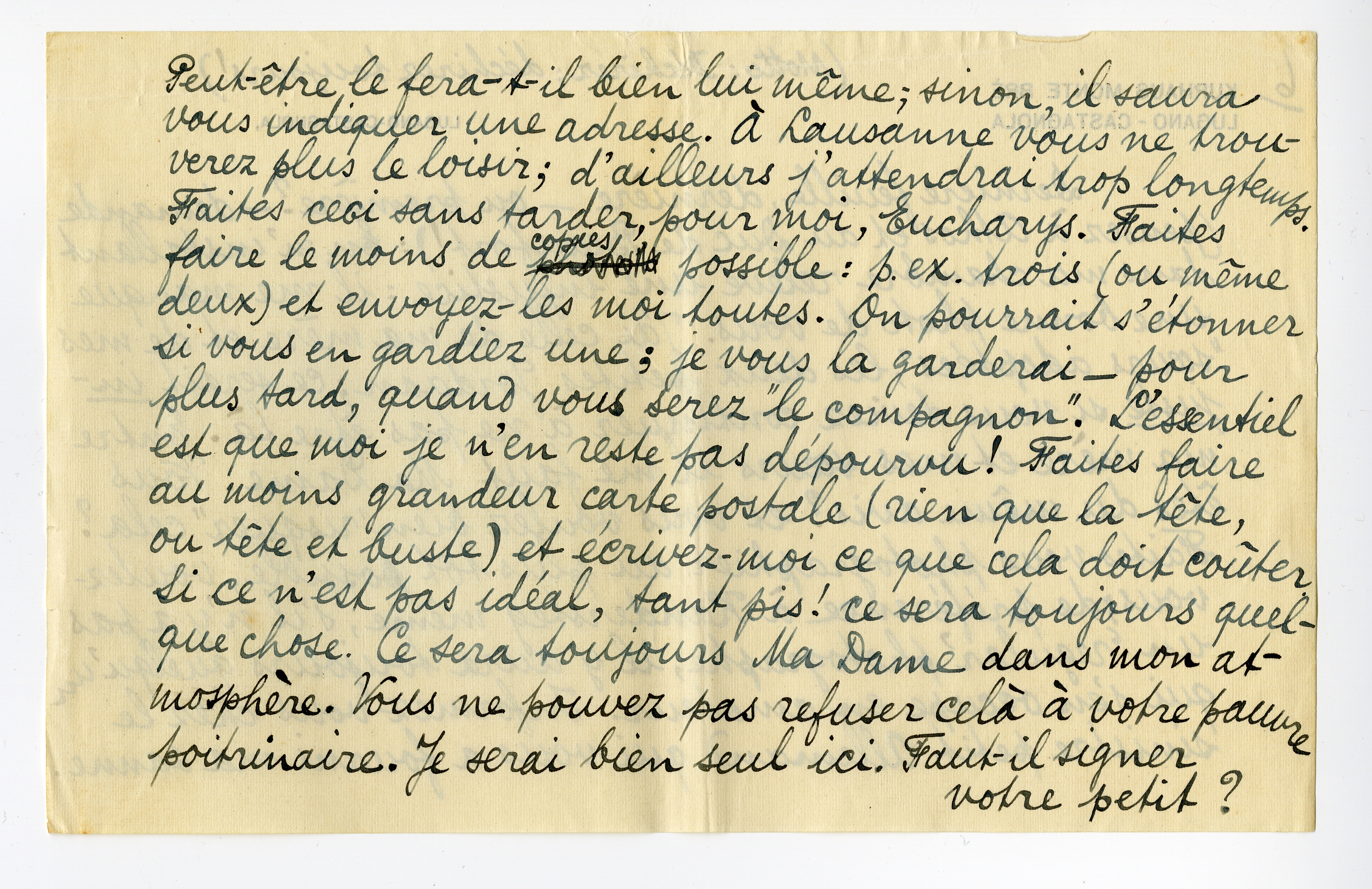 Peut-être le fera-t-il bien lui même; sinon, il saura vous indiquer une adresse. À Lausanne vous ne trouverez plus le loisir; d'ailleurs j'attendrai trop longtemps. Faites ceci sans tarder, pour moi, Eucharys. Faites faire le moins de copies possible: p. ex. trois (ou même deux) et envoyez-les moi toutes. On pourrait s'étonner si vous en gardiez une; je vous la garderai - pour plus tard, quand vous serez ‘le compagnon’. L'essentiel est que moi je n'en reste pas dépourvu! Faites faire au moins grandeur carte postale (rien que la tête, ou tête et buste) et écrivez-moi ce que cela doit coûter. Si ce n'est pas idéal, tant pis! ce sera toujours quelque chose. Ce sera toujours Ma Dame dans mon atmosphère. Vous ne pouvez pas refuser celà à votre pauvre poitrinaire. Je serai bien seul ici. Faut-il signer votre petit?
