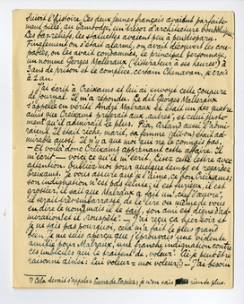 À Locarno (le seul soir que j'y étais, vous savez quand!) j'ai acheté un journal. Je l'avais acheté parce qu'un titre m'avait frappé: ‘Deux jeunes français se laissent condamner pour avoir visité avec trop d'insistance (ou quelque chose dans ce gout-là) un temple hindou’. Suivit l'histoire. Ces deux jeunes français avaient parfaitement pillé, au Cambodge, un ‘trésor d'architecture bouddhique’. Les bas-reliefs, les statuettes avaient peu à peu disparu. Finalement on s'était alarmé, on avait découvert les coupables, on les avait condamnés, le principal personnage, un nommé Georges Malleraux (‘littérateur à ses heures’) à 3 ans de prison et le complice, certain Chenavan, je crois à 1 an.