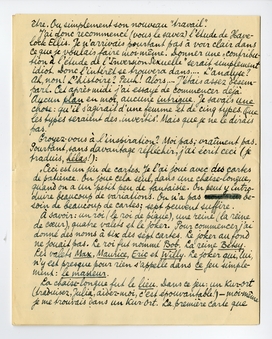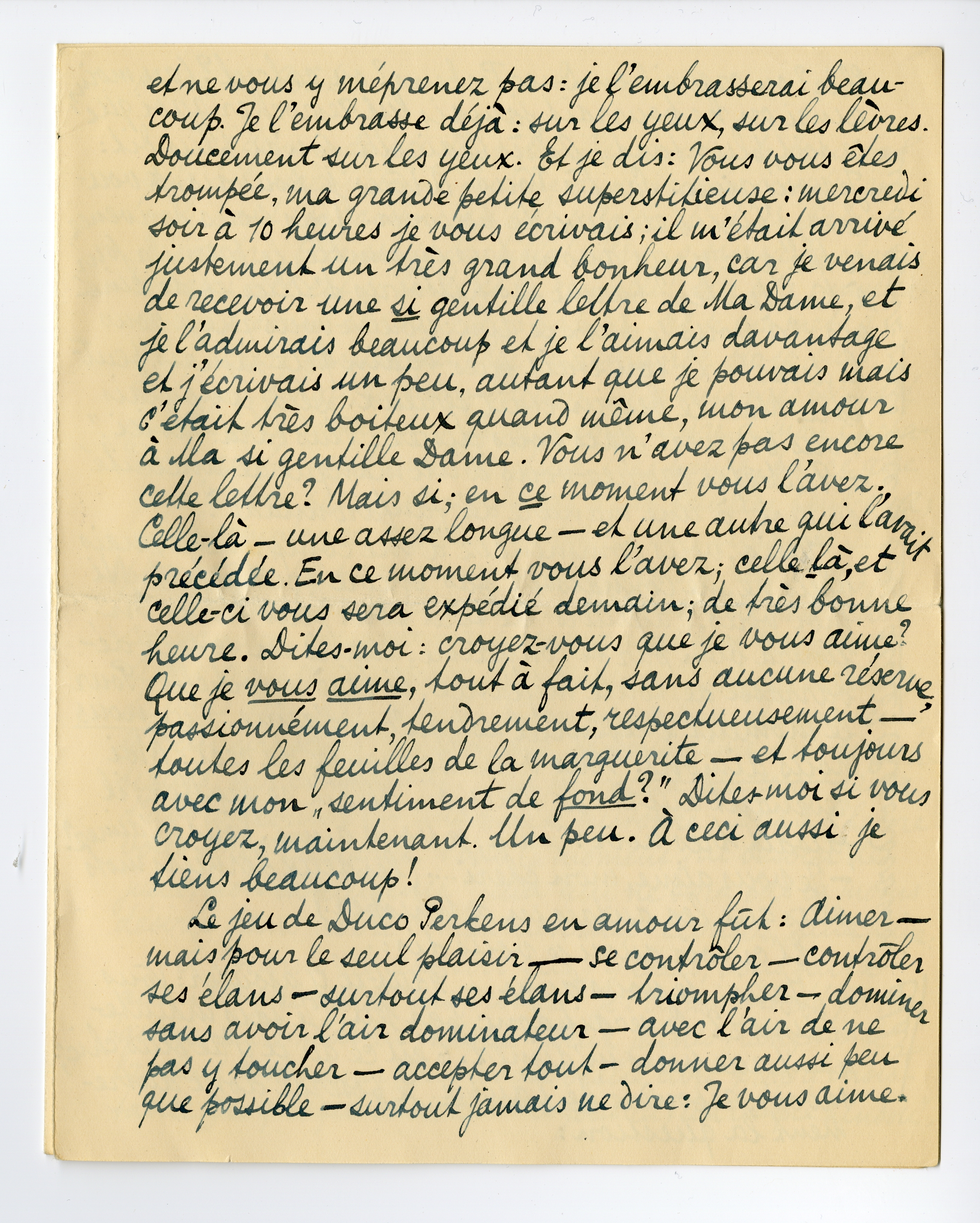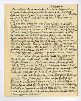 Venez tout près de moi, Julia, Eucharys, Eucharys et Julia. Vrai, j'aime Julia autant qu'Eucharys. En ce moment je veux toujours Julia. Peut-être que Julia deviendra Eucharys tout à l'heure. C'est même probable - pendant, ou après cette lettre. Pour le moment il me faut Julia. La superstitieuse, la sérieuse; et ne vous y méprenez pas: je l'embrasserai beaucoup. Je l'embrasse déjà: sur les yeux, sur les lèvres. Doucement sur les yeux. Et je dis: Vous vous êtes trompée, ma grande petite superstitieuse: mercredi soir à 10 heures je vous écrivais; il m'était arrivé justement un très grand bonheur, car je venais de recevoir une si gentille lettre de Ma Dame, et je l'admirais beaucoup et je l'aimais davantage et j'écrivais un peu, autant que je pouvais mais c'était très boiteux quand même, mon amour à Ma si gentille Dame. Vous n'avez pas encore cette lettre? Mais si; en ce moment vous l'avez. Celle-là - une assez longue - et une autre qui l'avait précédée. En ce moment vous l'avez; celle-là, et celle-ci vous sera expédié demain; de très bonne heure. Dites-moi: croyez-vous que je vous aime? Que je vous aime, tout à fait, sans aucune réserve, passionnément, tendrement, respectueusement - toutes les feuilles de la marguerite - et toujours avec mon ‘sentiment de fond?’ Dites-moi si vous croyez, maintenant. Un peu. À ceci aussi je tiens beaucoup!