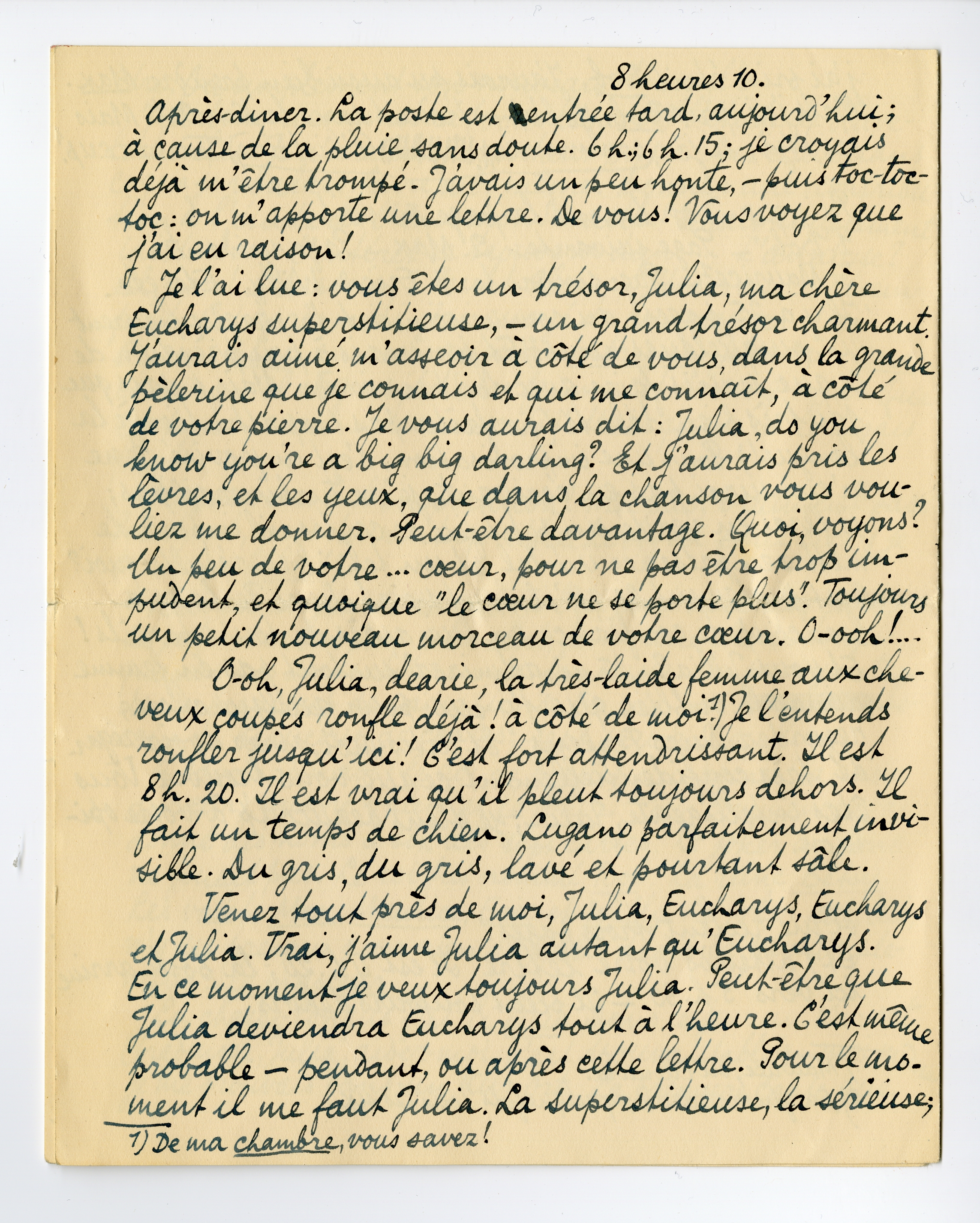 J'ai demandé ces deux feuilles doubles de beau papier à la très-vilaine femme aux cheveux coupés; en refusant les raisins qu'elle m'offrait: d'un balcon à l'autre. Elle est si gentille! si vous saviez, Eucharys dearie: elle est si laide et si gentille! Elle m'a immédiatement donné son meilleur papier. Et je me mets à vous écrire tandis qu'elle se demande où je suis resté, là, dehors, sur son balcon - (je suis très persuadé qu'elle se le demande.) Je vais donc écrire à mon Eucharys - en faisant mon écriture très petite, parce que je n'aurai plus rien après ces deux feuilles, peut-être; et il commence à pleuvoir dehors, sur Lugano. Il pleut déjà. Ce soir, j'en suis sûr, vous m'écrirez; je veux dire: j'aurai une lettre de vous. Oh, j'en suis convaincu, vous verrez si je n'aurai pas raison. Alors, vous me forcerez de nouveau (litteralement!) de vous dire des: je vous aime, sans fin, et sans rime, et peut-être sans raison, des je vous aime très authentiques, par conséquent. C'est pour cela que vous devez d'abord écouter: - une petite histoâre. Tout à l'heure vous serez Eucharys. Pour le moment j'ai besoin de Julia, mon intelligente Julia qui ne sera pas la moins désirée dans notre companion-ship. Ecoutez, Julia-mine: