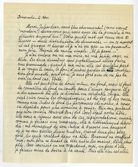 Merci, Julia-dear, vous-êtes charmante! (sans accent ‘mondain’) Savez-vous que vous avez été la première à me féliciter aujourd'hui? Votre gentil mot est venu vers 10 heures - seule distribution de dimanche - en ce moment il est presque 11 heures et je n'ai vu que - en passant - mon père. Poignée de main simple. ‘Et je passe....’