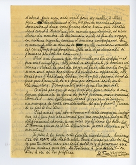 Elle est Hongroise, j'ai fait sa connaissance dans le train, entre Menton et Monte-Carlo. Elle fumait une cigarette dans le corridor, je lui ai demandé du feu; elle m'a demandé des renseignements sur les contrées proches d'abord, puis mon aide viril pour ses malles, à Nice; puis - le déraillement d'un wagon de marchandises barricadant deux voies ferrées, notre train qui s'arrête tout court à Beaulieu, du monde qui descend, et nous étions du nombre. Le lendemain suite et fin du voyage, en voiture ouverte, comme d'anciens compagnons. En ce moment elle se demande quelle inversion sexuelle est cause de ma pudibonderie. (Elle m'a déjà demandé si j'aimais plutôt les hommes.)