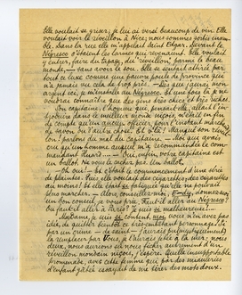 Ma Dame, je suis si content, moi, vous n'en avez pas idée, de quitter bientôt ce très-embêtant personnage! Si par un crime - de saint - j'aurais pu (mystiquement) la remplacer par Vous, je l'aurais jetée à la mer: nous deux, nous aurions su nous ficher autrement d'un réveillon mondain niçois, j'espère. Quelle insupportable promenade, avec cette femme qui par des miauleries d'enfant gâtée essayait de me tirez des mots doux.