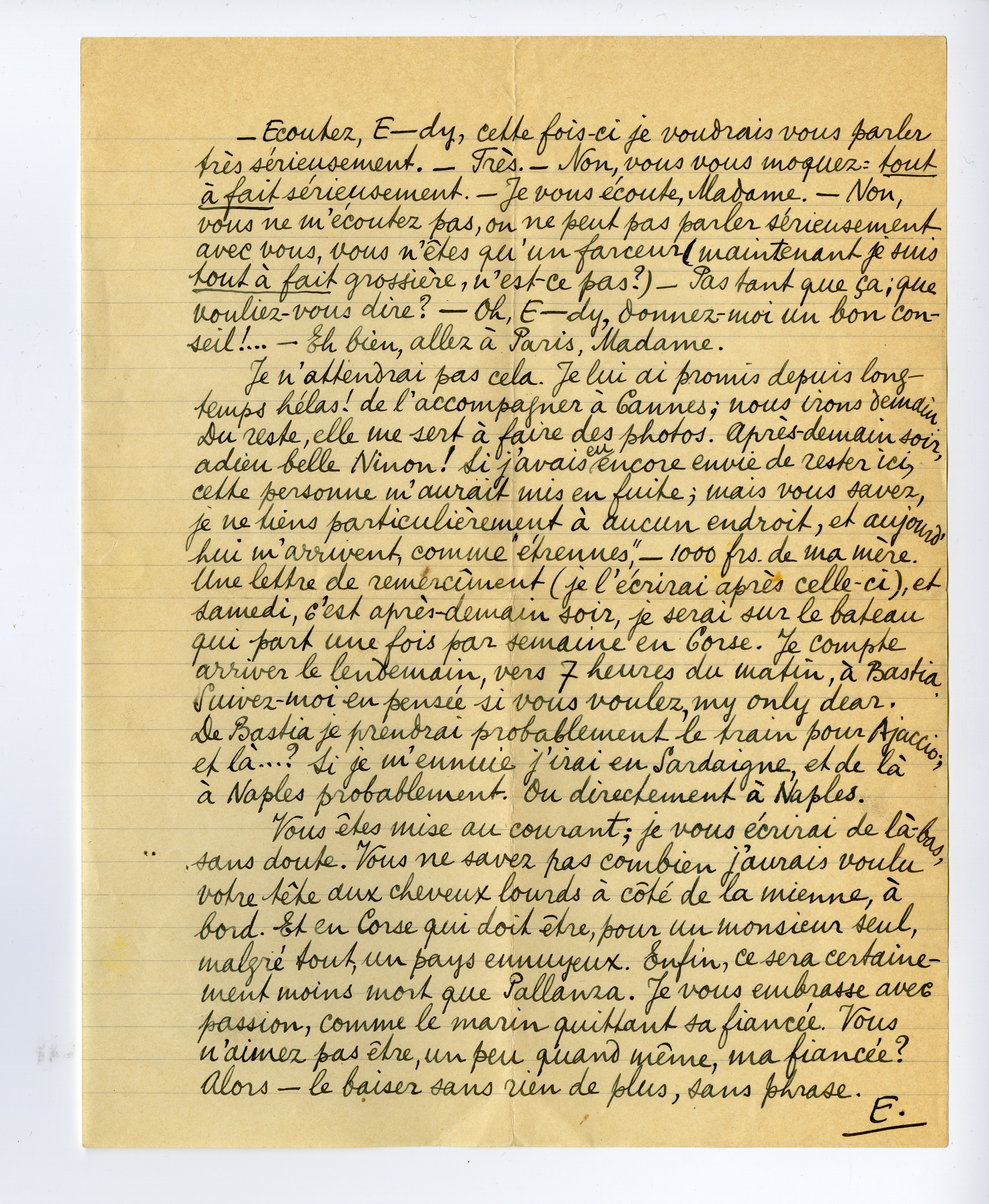 Je n'attendrai pas cela. Je lui ai promis depuis longtemps hélas! de l'accompagner à Cannes; nous irons demain. Du reste, elle me sert à faire des photos. Après-demain soir, adieu belle Ninon! Si j'avais eu encore envie de rester ici, cette personne m'aurait mis en fuite; mais vous savez, je ne tiens particulièrement à aucun endroit, et aujourd'hui m'arrivent, comme ‘étrennes’, - 1000 frs. de ma mère. Une lettre de remercîment (je l'écrirai après celle-ci), et samedi, c'est après-demain soir, je serai sur le bateau qui part une fois par semaine en Corse. Je compte arriver le lendemain, vers 7 heures du matin, à Bastia. Suivez-moi en pensée si vous voulez, my only dear. De Bastia je prendrai probablement le train pour Ajaccio; et là....? Si je m'ennuie j'irai en Sardaigne, et de là à Naples probablement. Ou directement à Naples.