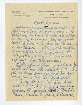 Bon. D'abord, j'ai changé d'hôtel Ça, tout de suite; coûte que coûte, il me fallait au moins de l'électricité. Et un bain. Je les ai eus. Oh, ici, c'est assez bien - comme j'ai dit: unique; pour Ajaccio: unique! Aussi les chambres sont à 20 francs, rien que les chambres, et les plus petites. Mais malgré tout ça - ah, j'oublie le jardin, qui est splendide - comment partir au plus vite?