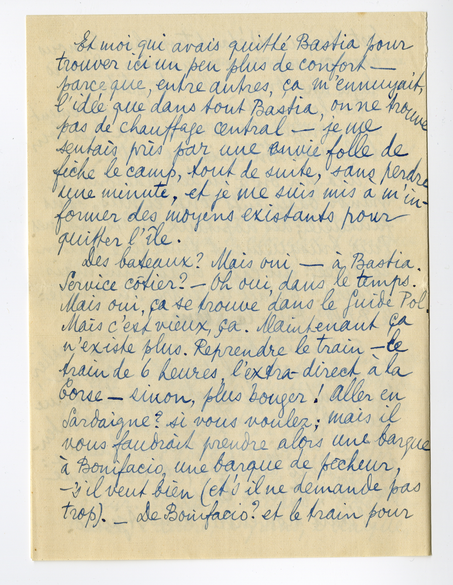 Et moi qui avais quitté Bastia pour trouver ici un peu plus de confort - parce-que, entre autres, ça m'ennuyait, l'idée que dans tout Bastia, on ne trouve pas de chauffage central - je me sentais pris par une anvie folle de fiche le camp, tout de suite, sans perdre une minute, et je me suis mis à m'informer des moyens existants pour quitter l'île.