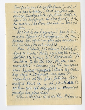 J'ai fait téléphoner, à l'instant même. Mais voilà; décidément, je n'ai pas de chance, cette fois-ci; on n'était pas très sûr, là-bas, si l'on pouvait me prendre, jeudi. L'avion ne peut transporter que deux voyageurs à la fois. On en avait déjà un. On attendait un autre, qui devait arriver demain. Si celui-là, par hasard, n'arrivait pas - alors, avec-tout le plaisir du monde. Et voilà, Ma Dame Mal-Aimée, que j'attends. Demain, je serai fixé. L'avion - et Antibes (et puis?...) - ou le petit train; et l'exil, - d'une semaine - à Bastia; suivi par Livourne (et puis?...) Je ne peux en tout cas pas rester ici jusqu'à un autre départ d'avion. C'est très-couteux -, ce fameux hôtel. C'est très-couteux, l'avion. Ceci épuise cela.