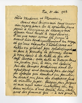 J'espère que de votre côté, vous, Monsieur et Madame, jouissez maintenant du beau temps Lausannois. Je vous vois prenant le repas sur le balcon avec devant vous Evian en couleurs de pastel - malgré la dorure du soleil! C'est beau mais au point de vue beauté de décor Pise aussi est unique. Ici davantage de couleurs de pastel et le soir, à notre fenêtre, nous laissons flotter nos regards sur l'Arno, le plus indolemment possible, tandis qu'au dessous de nous, dans le café d'à côté, un orchestre bien italien, bien langoureux donc, nous poursuit de ses mélodies, jusque dans nos lits où sautent - bien en contraste avec ce rythme berceur - où sautent allègrement les puces. - Monsieur et Madame, après cette description épique je demande la permission de me retirer. Veuillez faire mes amitiés à Madame et Monsieur Werner et croyez-moi bien respectueusement à vous