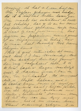 Voelt U zich intusschen al weer wat beter? ’t Was verstandig, dat U ons archief Dinsdag gans den rug toegekeerd hebt, ’t is de twee laatste dagen werkelijk niet te harden geweest van de kou - Een rijkskachel, die eenmaal uit is, blijft helaas uit - De laatste dagen vorder ik nogal goed aan Gijsbert Karel’s liefdes perikelen. Voor een dispuut bestaande uit louter ‘historische’ vrouwen, waarvan ik lid ben en een lezing moet houden, heb ik nu maar bovenstaand onderwerp gekozen, ’t is meteen een goede proefneming om te zien of ik er iets van maken kan. Ik werk er in ieder geval met buitengewoon plezier aan, met meer plezier dan aan de peper c.a.