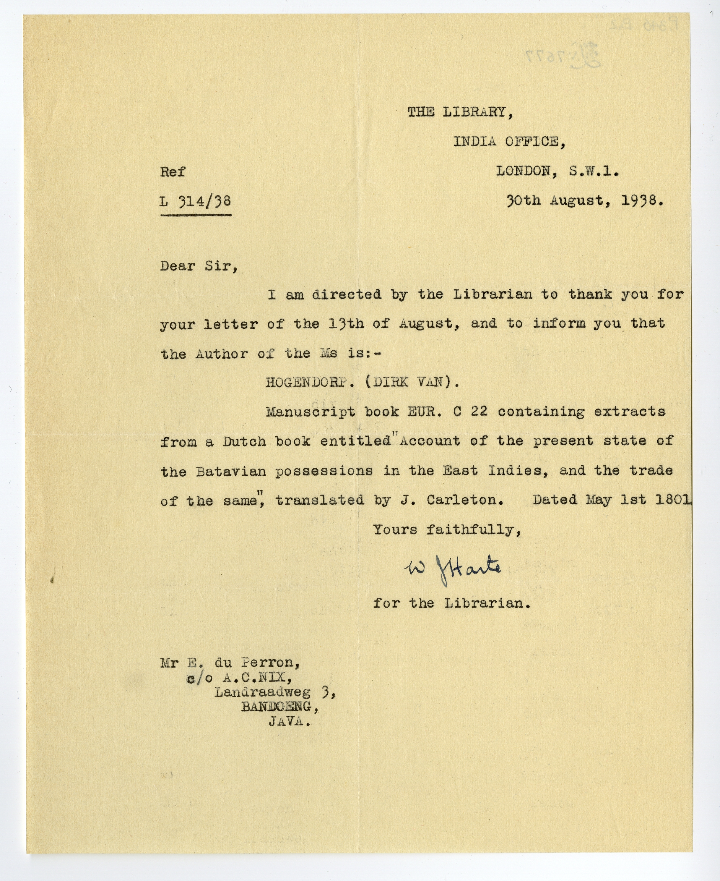 I am directed by the Librarian to thank you for your letter of the 13th of August, and to inform you that the Author of the Ms is:-