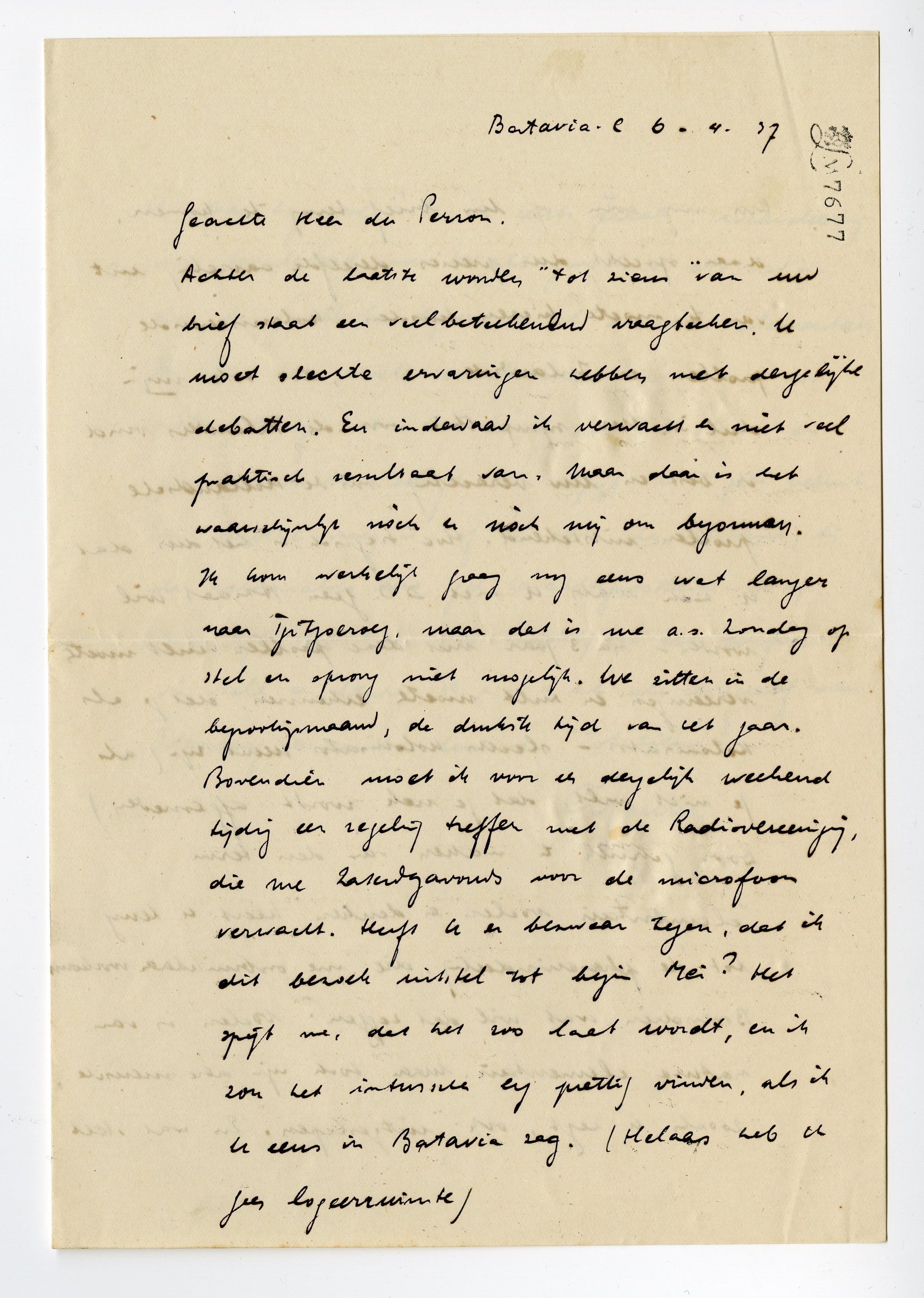 Achter de laatste woorden ‘tot ziens’ van uw brief staat een veelbetekenend vraagteken. U moet slechte ervaringen hebben met dergelijke debatten. En inderdaad ik verwacht er niet veel praktisch resultaat van, maar daar is het waarschijnlijk nòch u nòch mij om begonnen. Ik kom werkelijk graag nog eens wat langer in Tjitgoeroeg, maar dat is me a.s. Zondag op stel en sprong niet mogelijk. We zitten in de begrotingsmaand, de drukste tijd van het jaar. Bovendien moet ik voor een dergelijk weekend tijdig een regeling treffen met de Radiovereeniging, die me Zaterdagavonds voor de microfoon verwacht. Heeft U er bezwaar tegen, dat ik dit bezoek uitstel tot begin Mei? Het spijt me, dat het zoo laat wordt, en ik zou het intusschen erg prettig vinden, als ik U eens in Batavia zag. (Helaas heb ik geen logeerruimte).