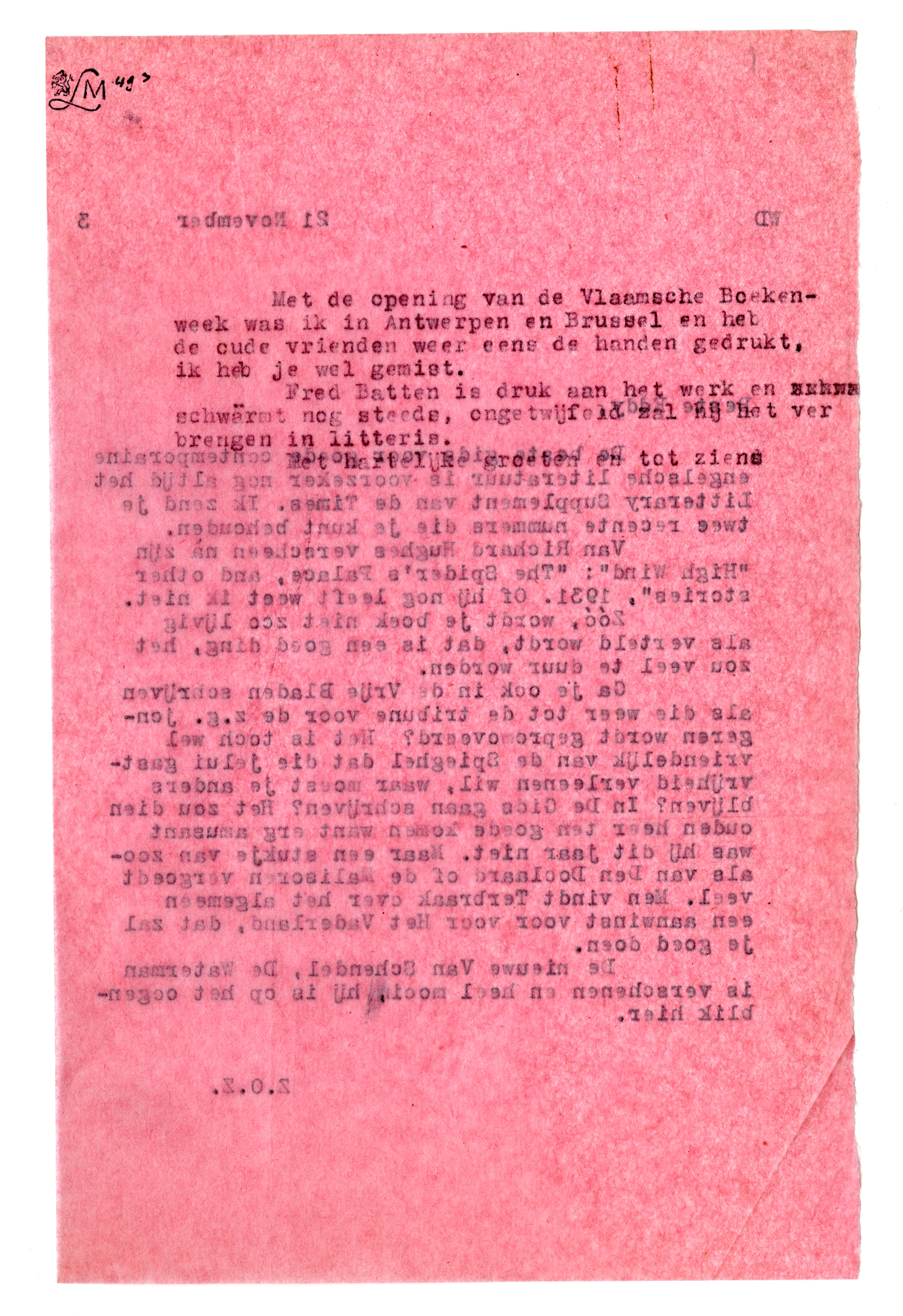 De beste gids voor goede contemporaine engelsche literatuur is voorzeker nog altijd het Litterary Supplement van de Times. Ik zend je twee recente nummers die je kunt behouden.