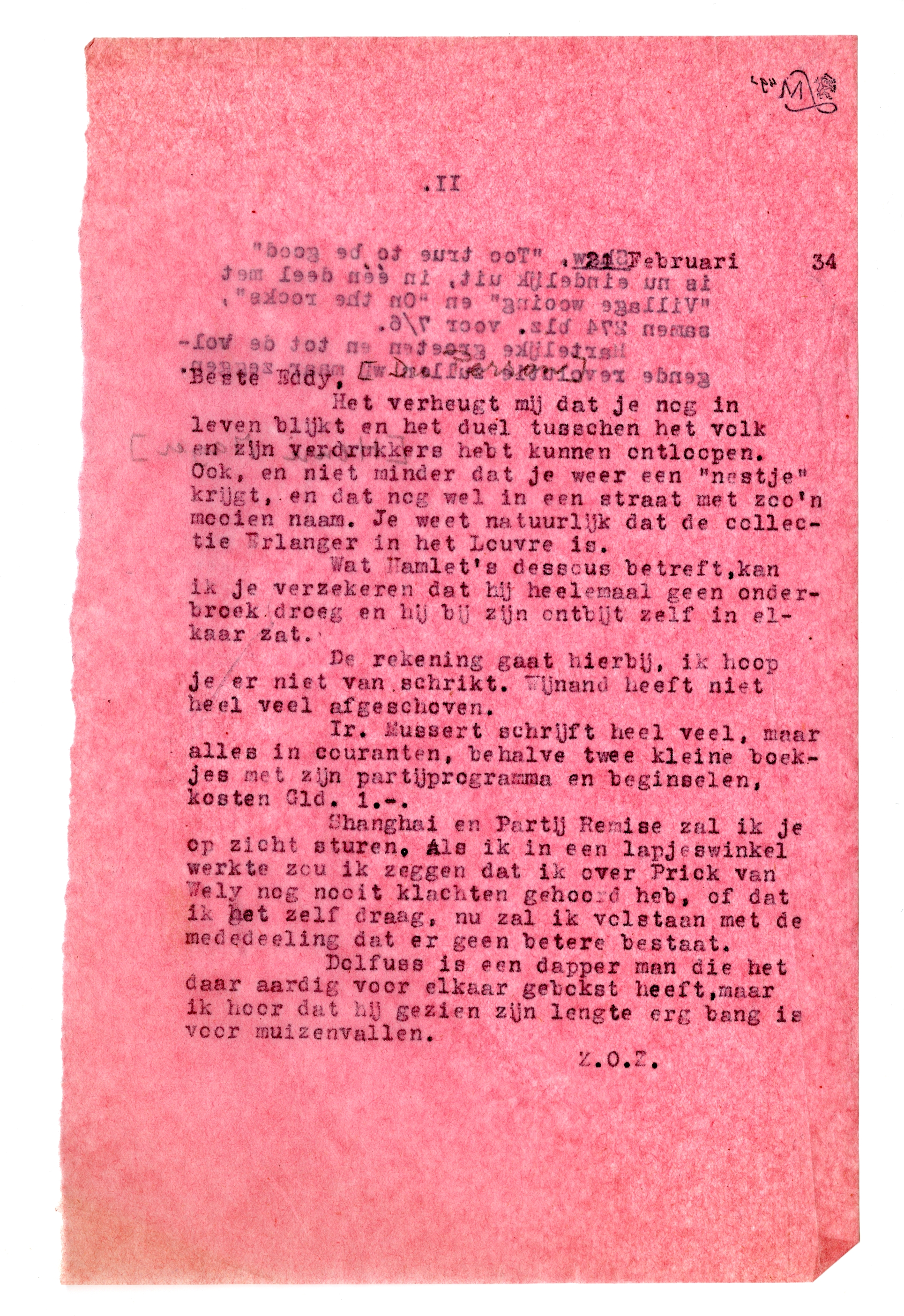 Het verheugt mij dat je nog in leven blijkt en het duel tusschen het volk en zijn verdrukkers hebt kunnen ontloopen. Ook, en niet minder dat je weer een ‘nestje’ krijgt, en dat nog wel in een straat met zoo’n mooien naam. Je weet natuurlijk dat de collectie Erlanger in het Louvre is.