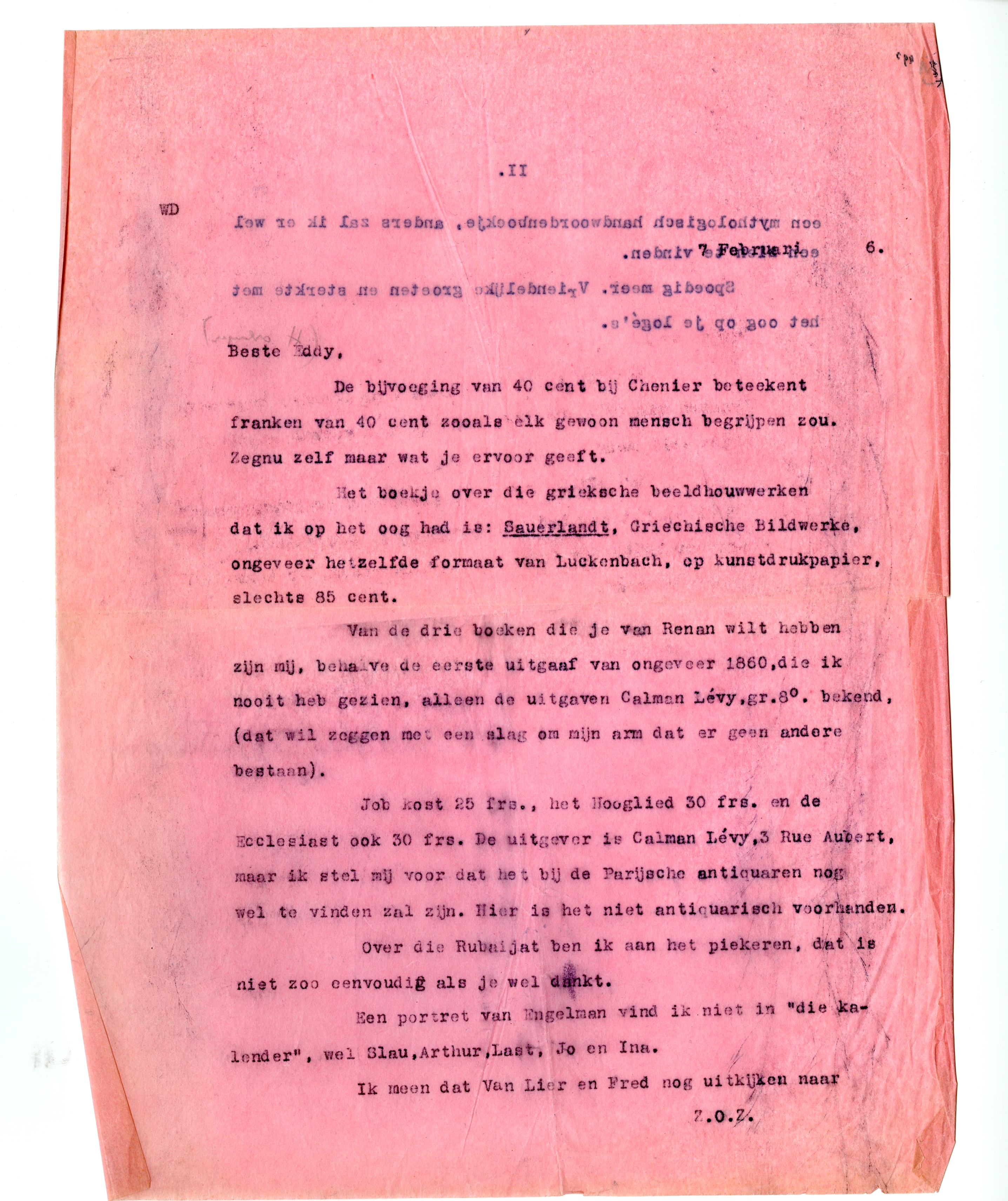Job kost 25 frs., het Hooglied 30 frs. en de Ecclesiat ook 30 frs. De uitgever is Calman Lévy, 3 Rue Aubert, maar ik stel mij voor dat het bij de Parijsche antiquaren nog wel te vinden zal zijn. Hier is het niet antiquarisch voorhanden.