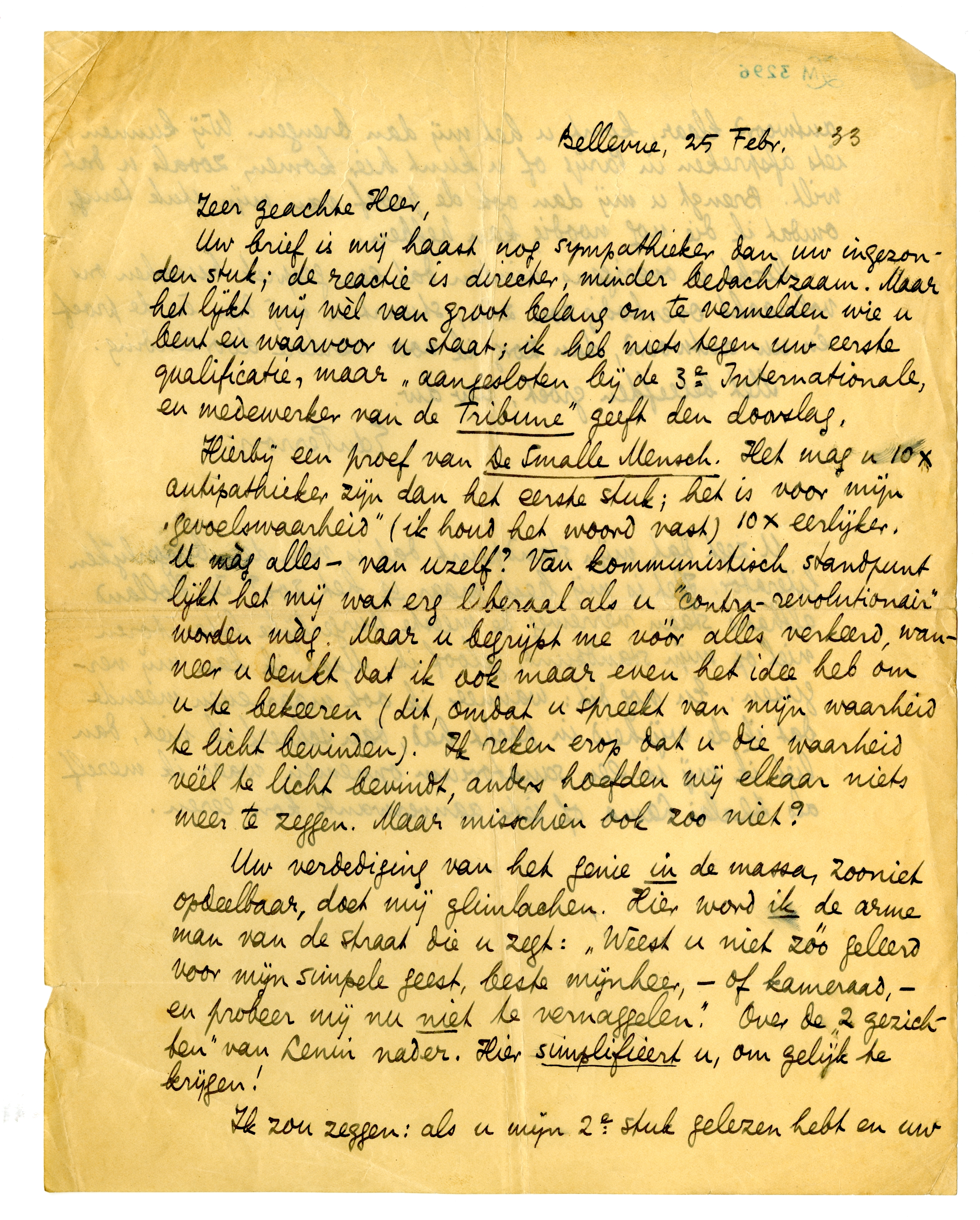 Uw brief15 is mij haast nog sympathieker dan uw ingezonden stuk; de reactie is directer, minder bedachtzaam. Maar het lijkt mij wèl van groot belang om te vermelden wie u bent en waarvoor u staat; ik heb niets tegen uw eerste qualificatie, maar ‘aangesloten bij de 3e Internationale, en medewerker van de Tribune’16 geeft den doorslag.