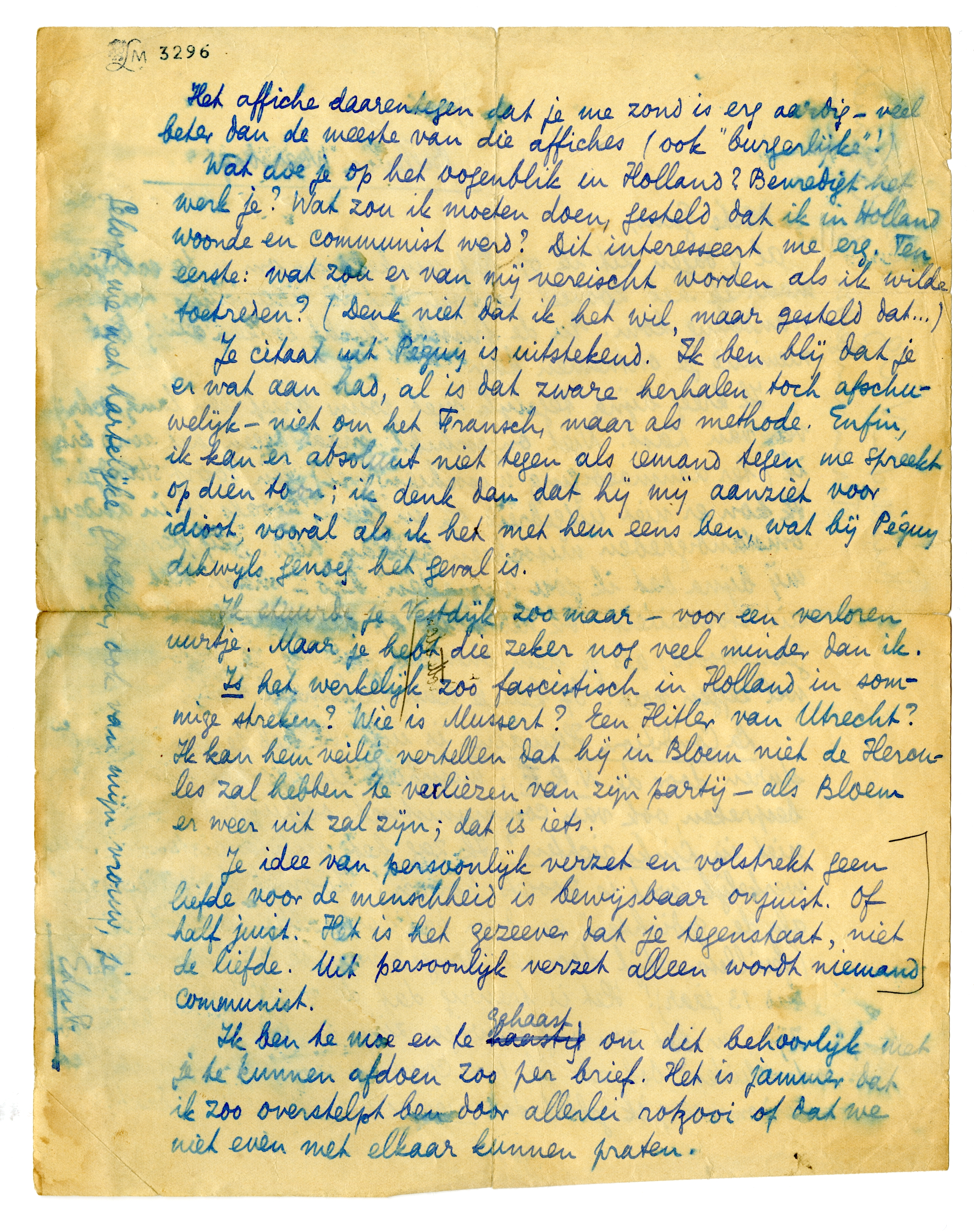 La Condition Humaine is uit. Ik heb je een ex. laten sturen door de N.R.F; misschien kun je het hier of daar bespreken, ook van communistisch oogpunt. (Waarom niet in Links richten?) Ik zag het antifascisten-nr. en werkelijk, wat is zooiets poover! Zoowel de ‘philosophie’ als de ‘gedichten’ en dan dat verhaaltje van Spoor33 (feuilleton-stijl door een jongen van de 1e klas H. BS. oud 13 jaar)! Het is treurig dat de middelen zoo gering zijn; en het zou nog treuriger zijn om de oogen daarvoor te sluiten. Ook als ik 10 x communist was, zou ik dat verdommen; ik geloof dat niemand daarmee is gebaat.