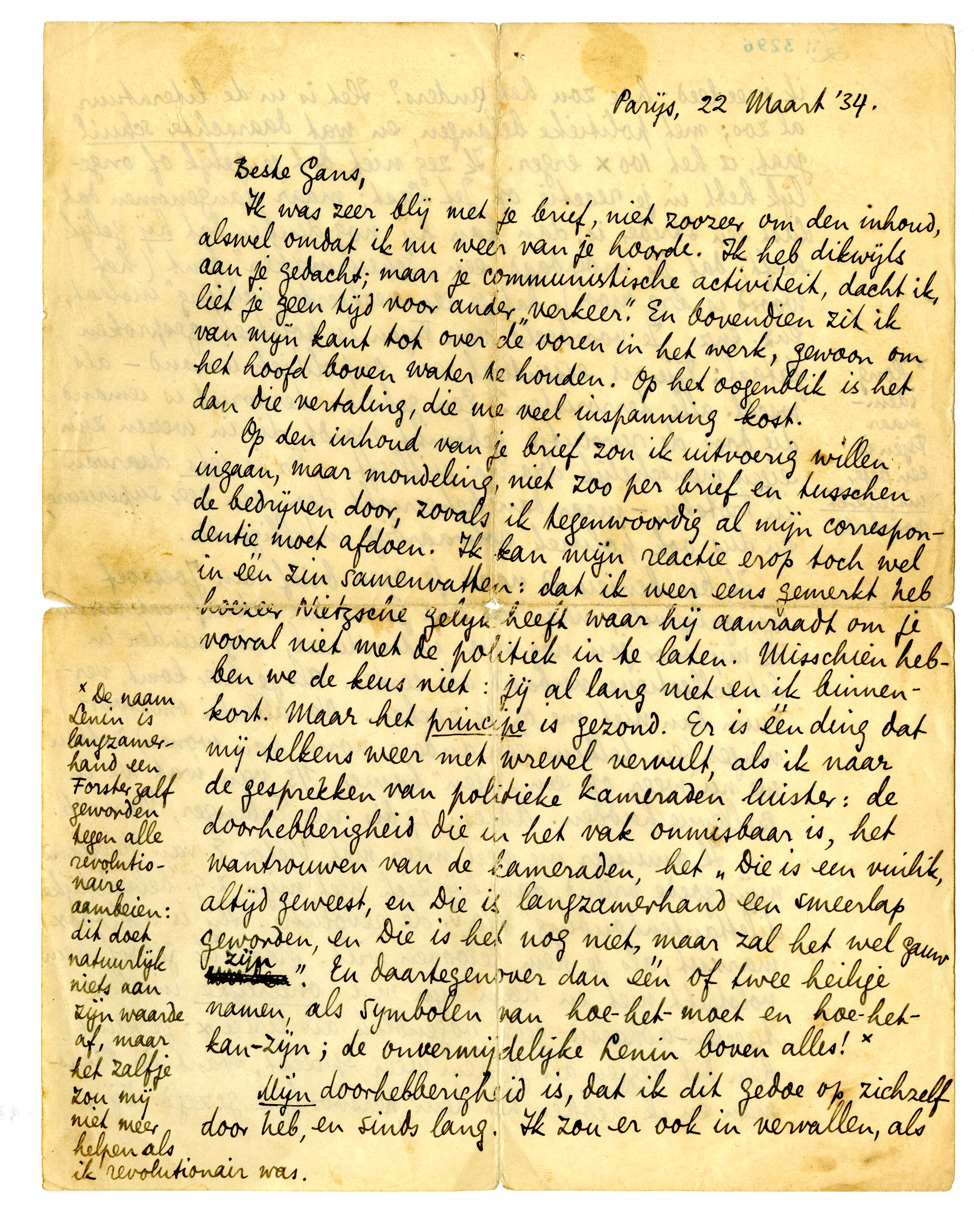 Op den inhoud van je brief zou ik uitvoerig willen ingaan, maar mondeling, niet zoo per brief en tusschen de bedrijven door, zooals ik tegenwoordig al mijn correspondentie moet afdoen. Ik kan mijn reactie erop toch wel in één zin samenvatten: dat ik weer eens gemerkt heb hoezeer Nietzsche gelijk heeft waar hij aanraadt om je vooral niet met de politiek in te laten. Misschien hebben we de keus niet: jij al lang niet en ik binnenkort. Maar het principe is gezond. Er is één ding dat mij telkens weer met wrevel vervult, als ik naar de gesprekken van politieke kameraden luister: de doorhebberigheid die in het vak onmisbaar is, het wantrouwen van de kameraden, het ‘Die is een