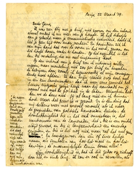Ken je hier in Parijs de communistische groep die ‘les dissidents’ wordt genoemd en die kritisch tegenover Moskou staat? Een van de voornaamste ‘ideologen’ ervan is Boris Souwarine42 (een naam aan Germinal van Zola ontleend, de man zelf heet Lipschitz, meen ik, en is Jood) Hij moet zeer sympathiek en zuiver zijn -(ik had er haast bij gezet: zoo lang het duurt). Als je hem zou willen kennen - misschien ken je hem al? - ken ik misschien wel een weg, via een anderen communist met wien ik ‘bevriend’ ben. Het zou kunnen zijn dat je genoeg krijgt van Holland en de verdachtmakingen daar en dat je liever weer eens hier komt om te zien of je je liier niet kunt aansluiten bij kameraden van een andere mentaliteit.
