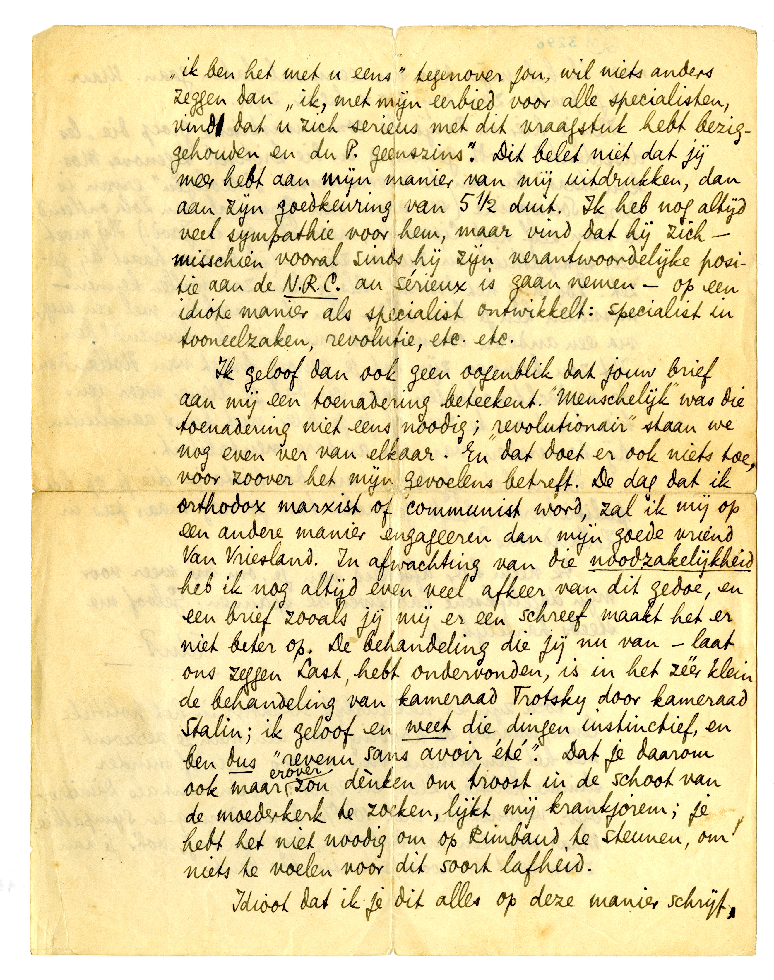 Ik amuseer me veel meer met Victor E. van Vriesland, mijn goede vriend, dan hij zich met mijn z.g. ‘belachelijke dilettantenhouding’ t.o.v. de revolutie. Hij is orthodox marxist, als je hem gelooven wilt. Maar ik geloof hem volstrekt niet en neem zijn m.i. oneerlijke intellectueelen-adhesie geen oogenblik au sérieux; je kunt hem dit zeggen als je hem weer spreekt, want èn Marsman èn ik hebben het hem persoonlijk gezegd. Zijn ‘ik ben het met u eens’ tegenover jou, wil niets anders zeggen dan ‘ik, met mijn eerbied voor alle specialisten, vind dat u zich serieus met dit vraagstuk hebt beziggehouden en du P. geenszins’. Dit belet niet dat jij meer hebt aan mijn manier van mij uitdrukken, dan aan zijn goedkeuring van 5½ duit. Ik heb nog altijd veel sympathie voor hem, maar vind dat hij zich - misschien vooral sinds hij zijn verantwoordelijke positie aan de N.R.C. au sérieux is gaan nemen - op een idiote manier als specialist ontwikkelt: specialist in tooneelzaken, revolutie, etc. etc.